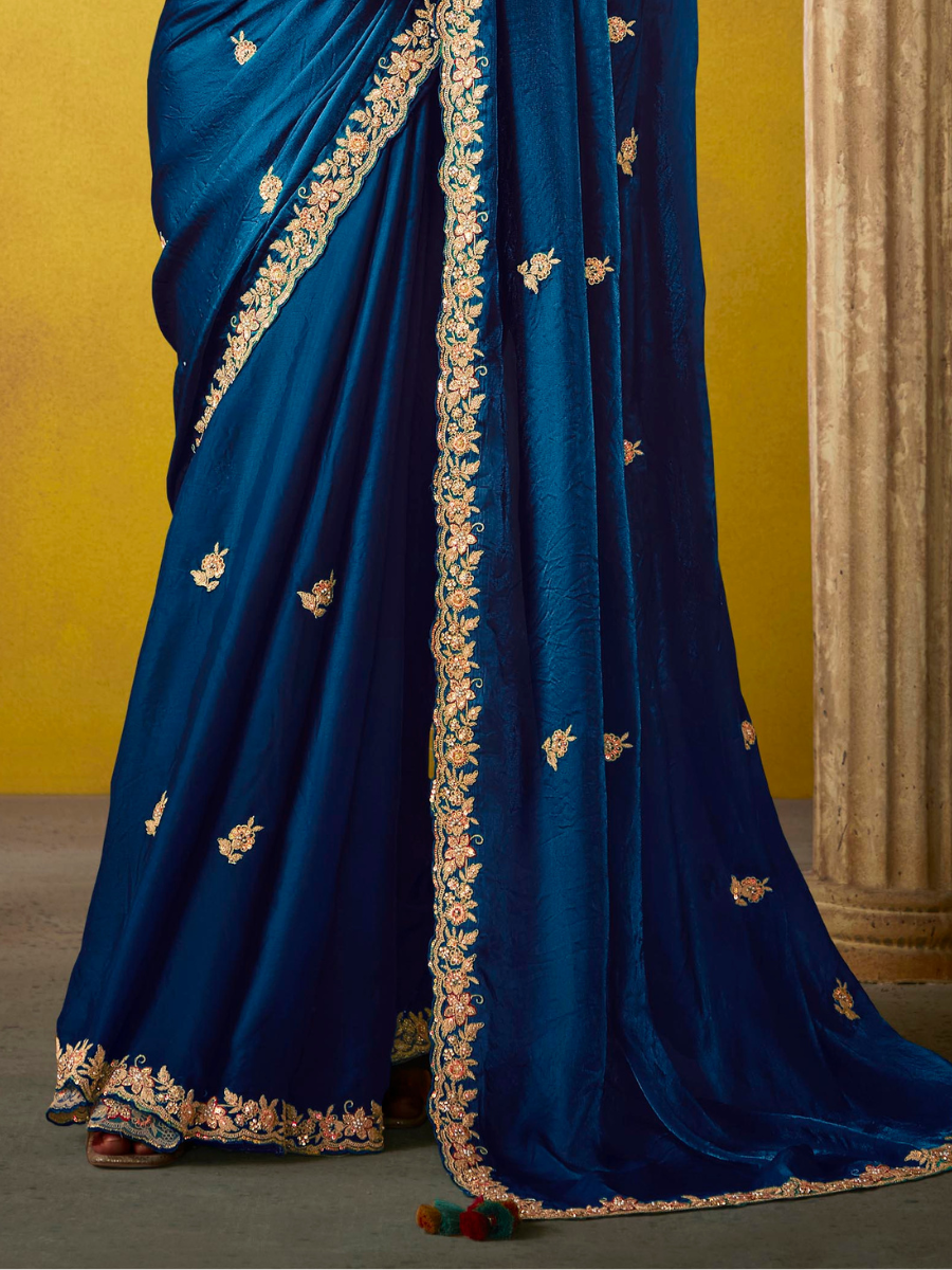This royal blue saree is made from tissue silk fabric, known for its light weight, soft texture, and natural shine. The fabric drapes smoothly and feels comfortable for long wear, making it suitable for festive functions, weddings, and special occasions.