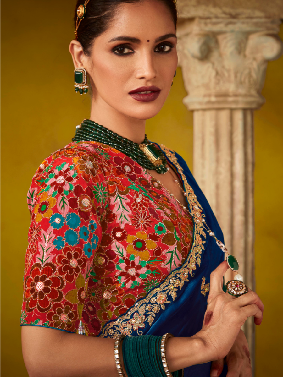 Royal Blue Tissue Silk Saree with Embroidered Border and Contrast Floral Blouse