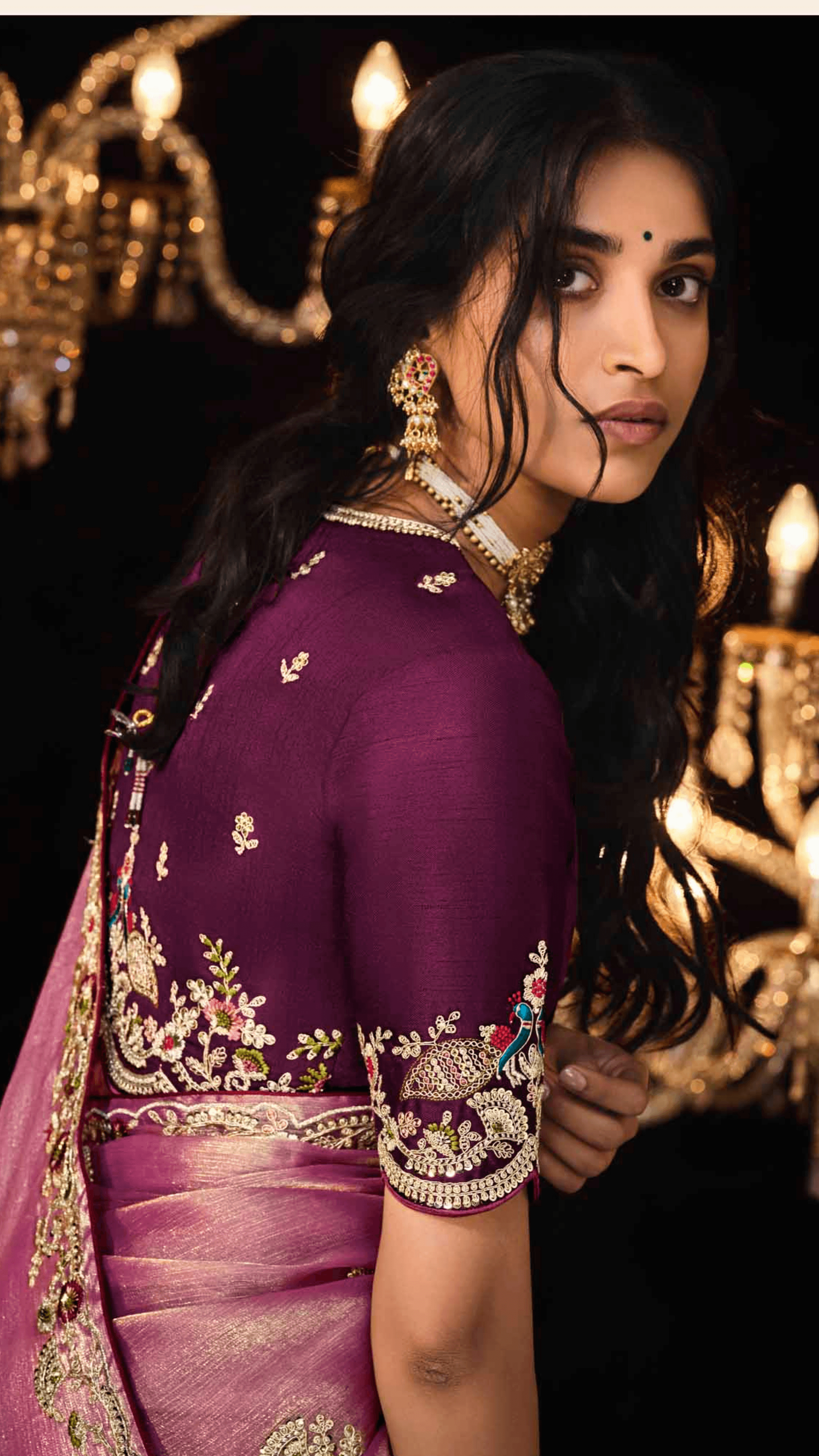 Completing this magnificent ensemble is a perfectly coordinated deep purple blouse, designed to complement the saree's intricate details. The blouse features matching embroidery on the sleeves, extending from the cuff up towards the elbow, echoing the motifs found on the saree's borders and pallu. This attention to detail ensures a harmonious and polished look, with every element contributing to the saree's luxurious appeal. The neckline is gracefully cut, providing a flattering silhouette that highlights the collarbones and neck, often adorned with a delicate choker-style necklace, as seen in the imagery.