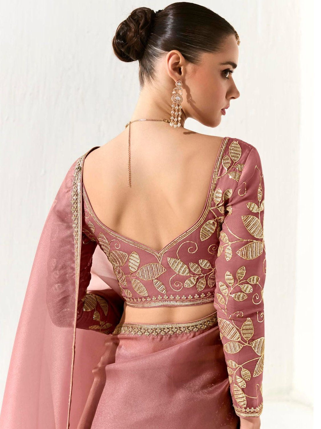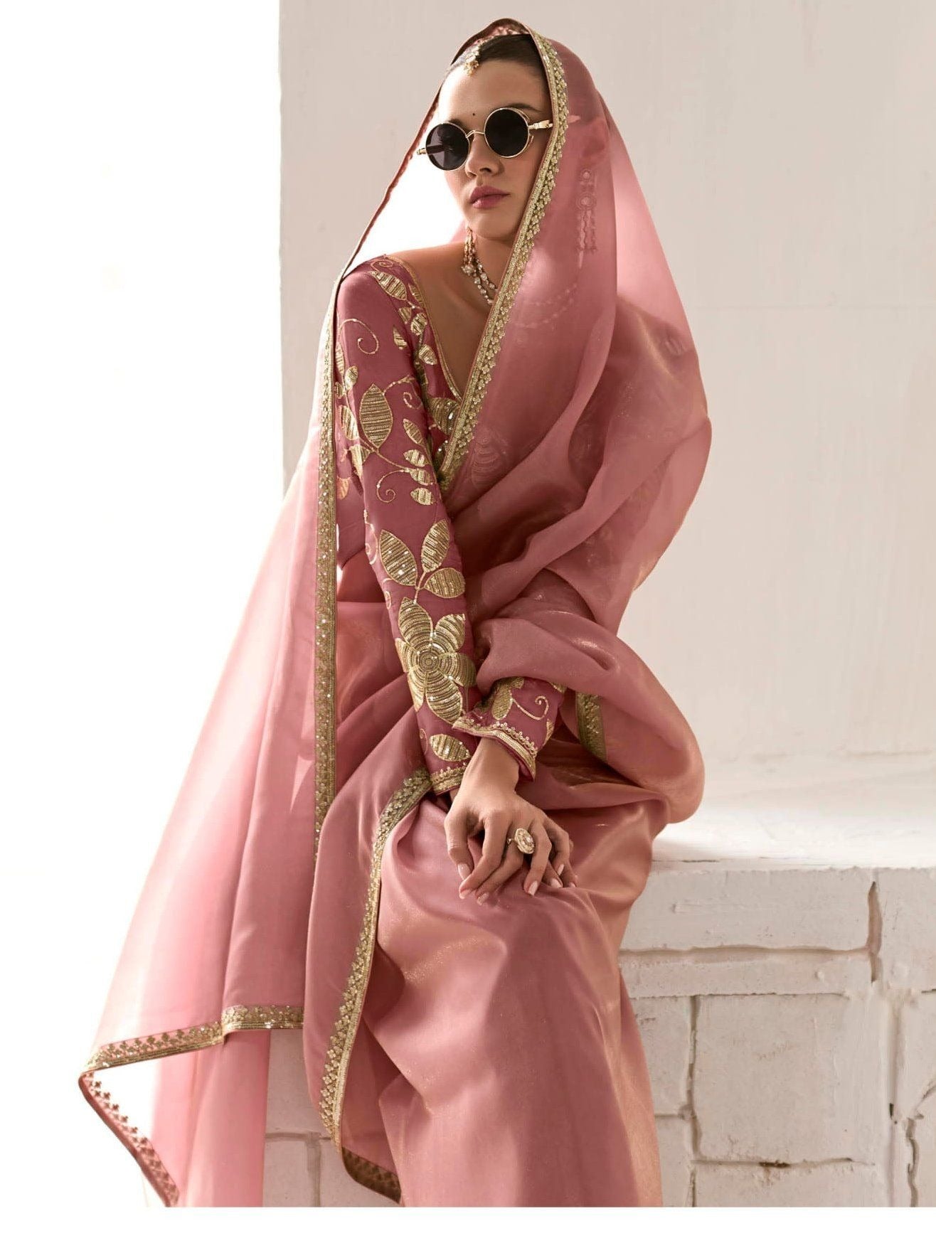 - Royal Pink Premium Organza Saree with Golden Sequin Blouse