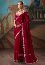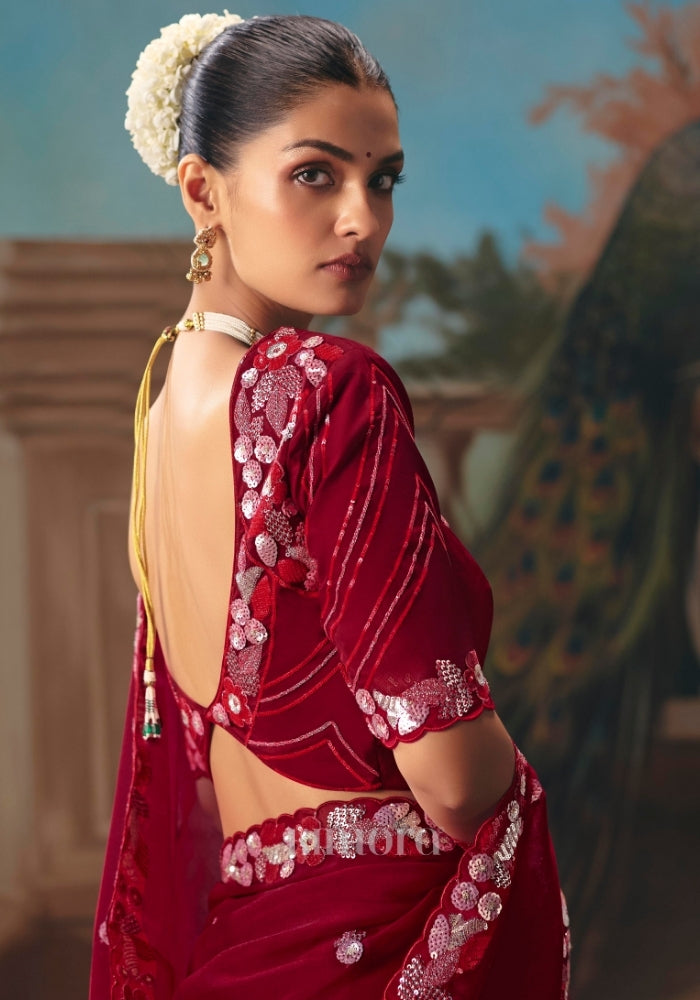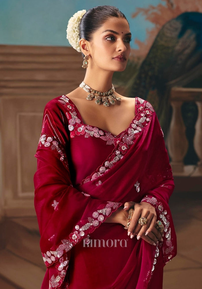 - Ruby Tissue Silk Sequence Embroidered Saree In Red