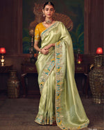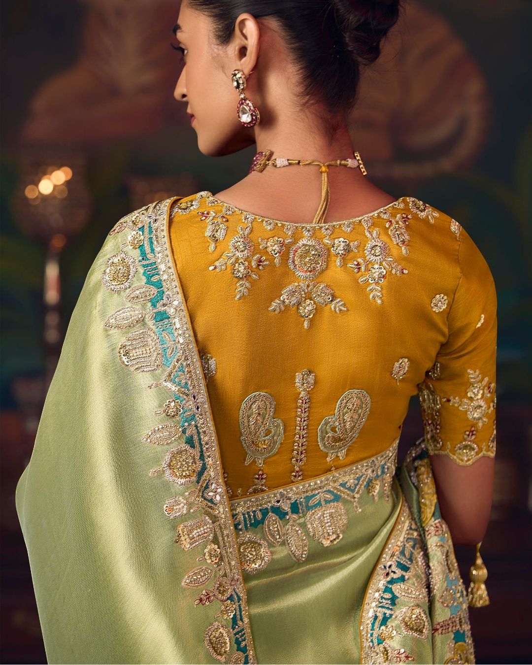 Sage Green Silk Saree with Hand Embroidery & Mustard Blouse