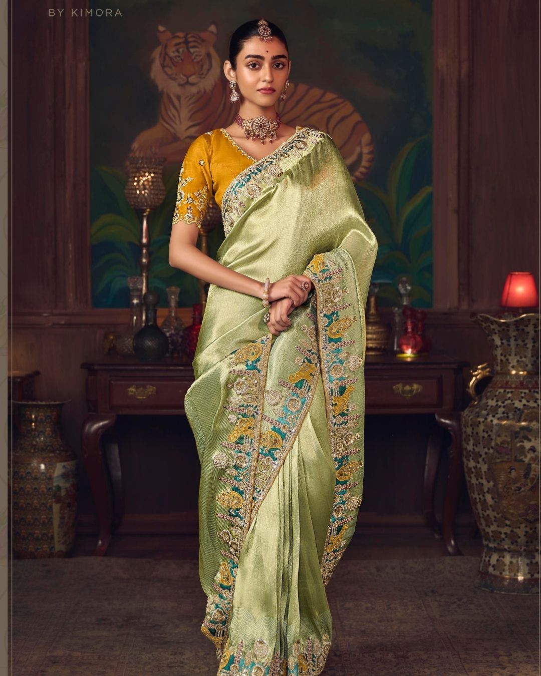 - Sage Green Silk Saree with Hand Embroidery & Mustard Blouse
