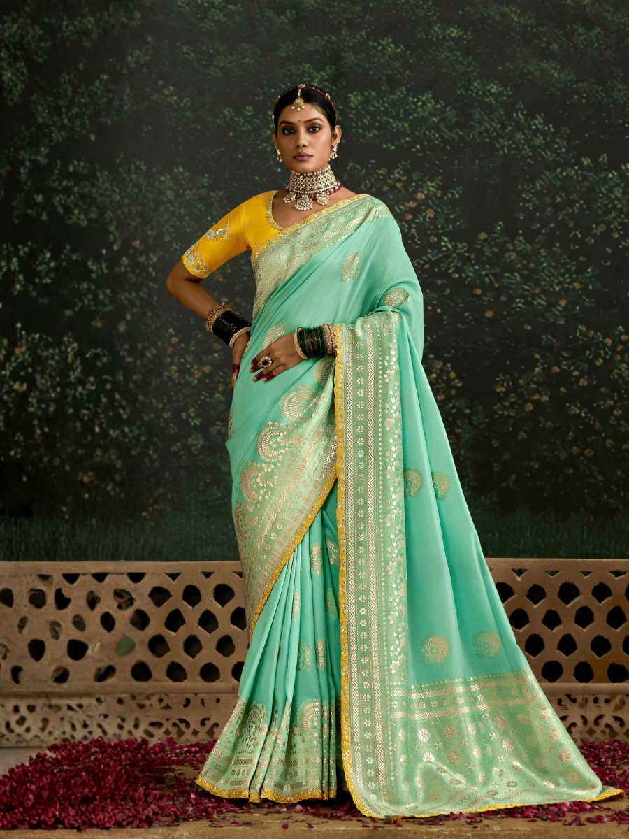 The soothing sea green shade is enriched with golden Banarasi zari work, intricately woven across the fabric to create a regal and timeless look. The saree comes with a vibrant yellow contrast blouse piece, also in Dola silk, adding a lively splash of color that perfectly balances the overall elegance of the ensemble.