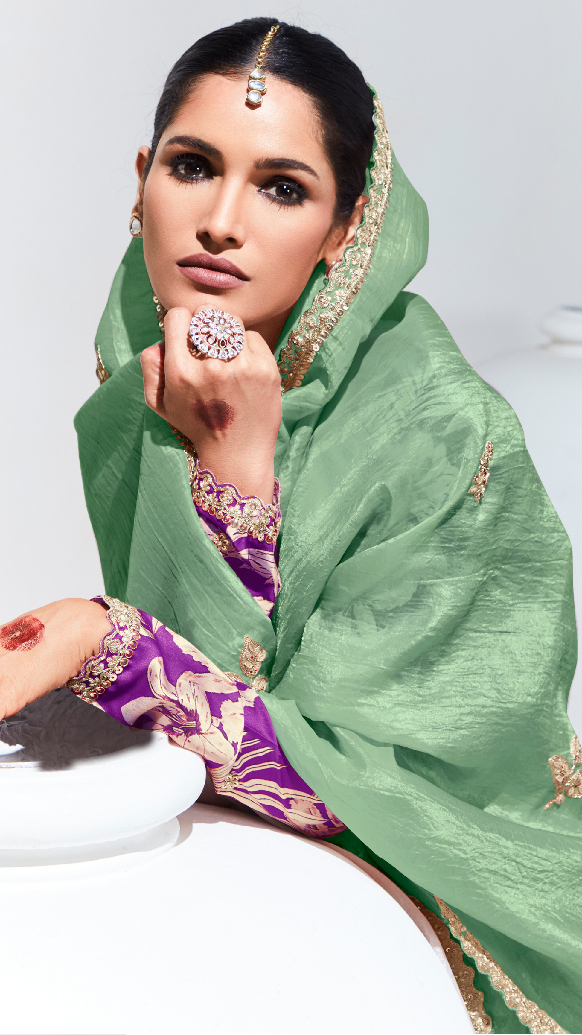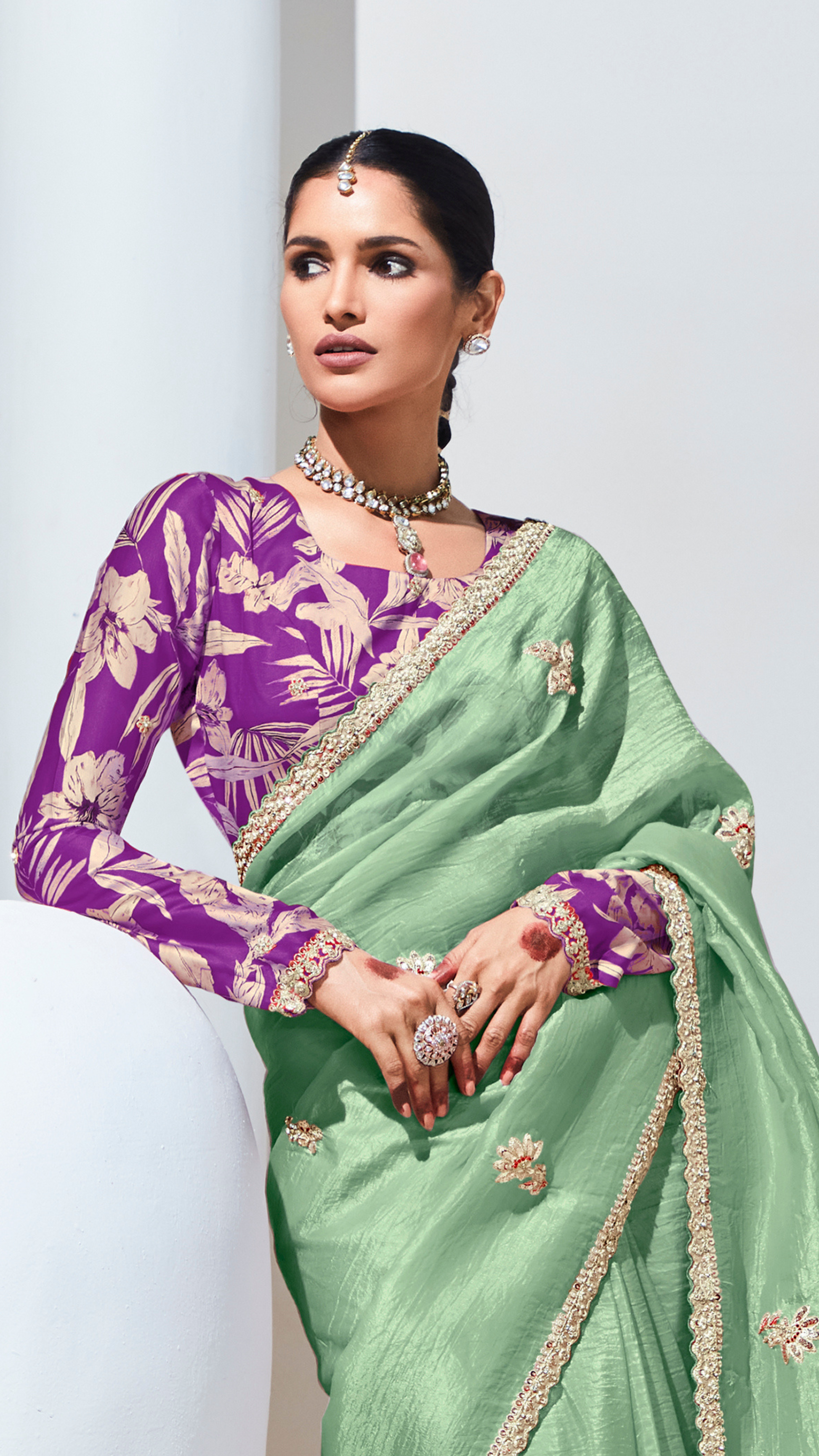 This Green Tissue Silk Saree is designed to bring a rich and festive look. The saree is decorated with zari, sequins, and bead work, which shine beautifully and give it a special charm. The light and soft texture of tissue silk makes it comfortable to wear while still looking grand.