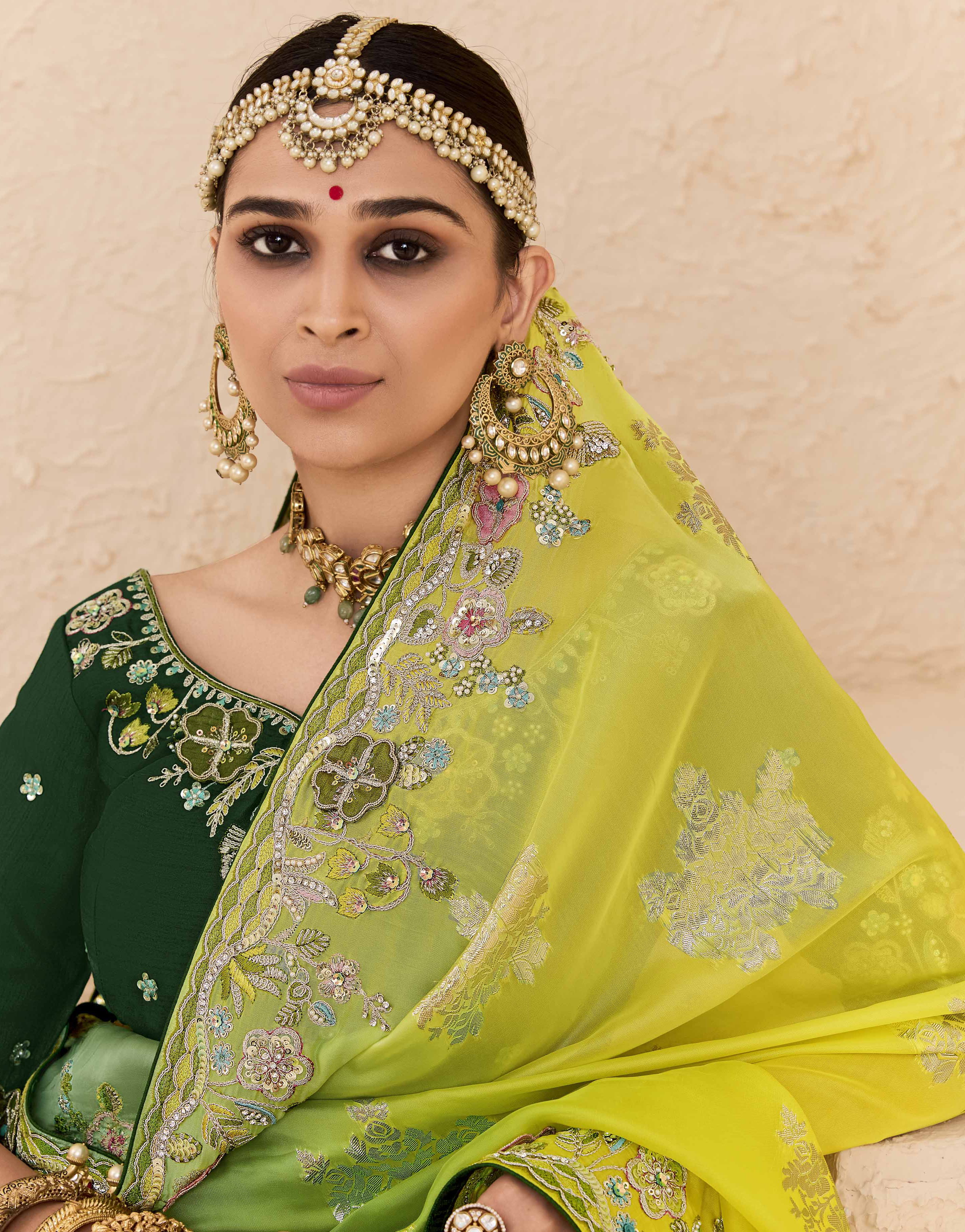 This Shaded Green & Yellow Tussar Silk Saree is made for women who love fresh and bright colors. The saree moves beautifully from soft green to sunny yellow, giving it a natural ombre look.