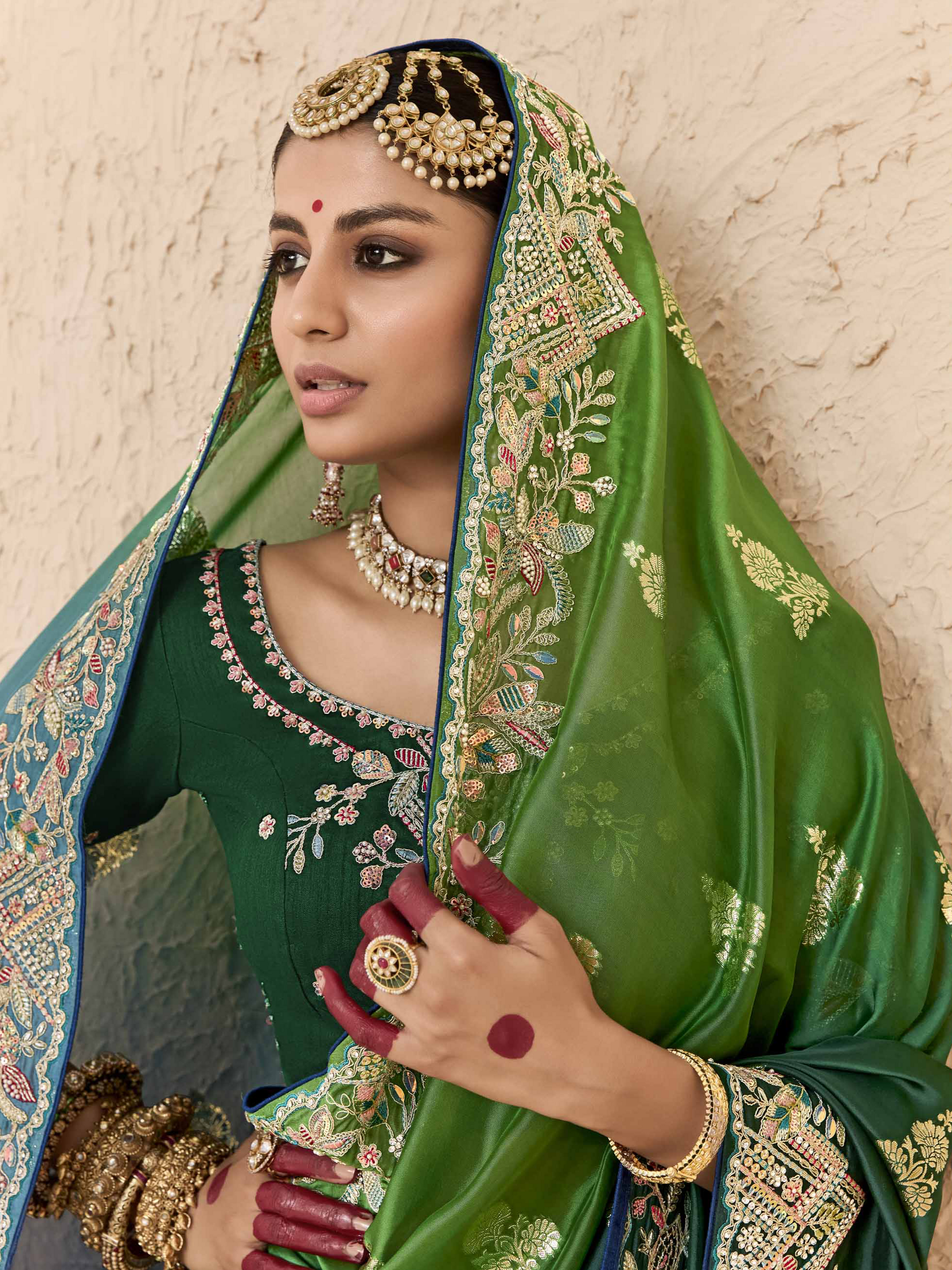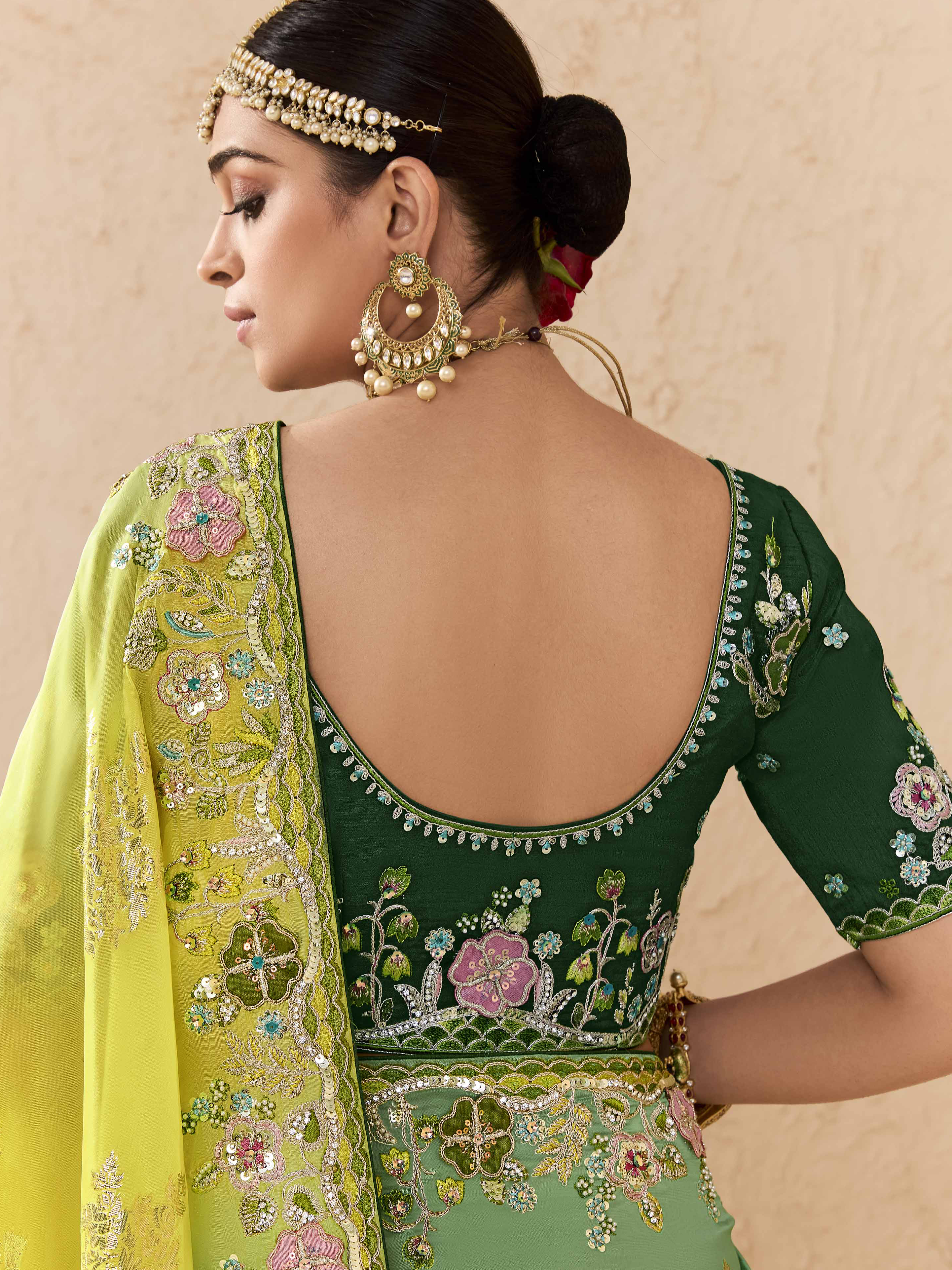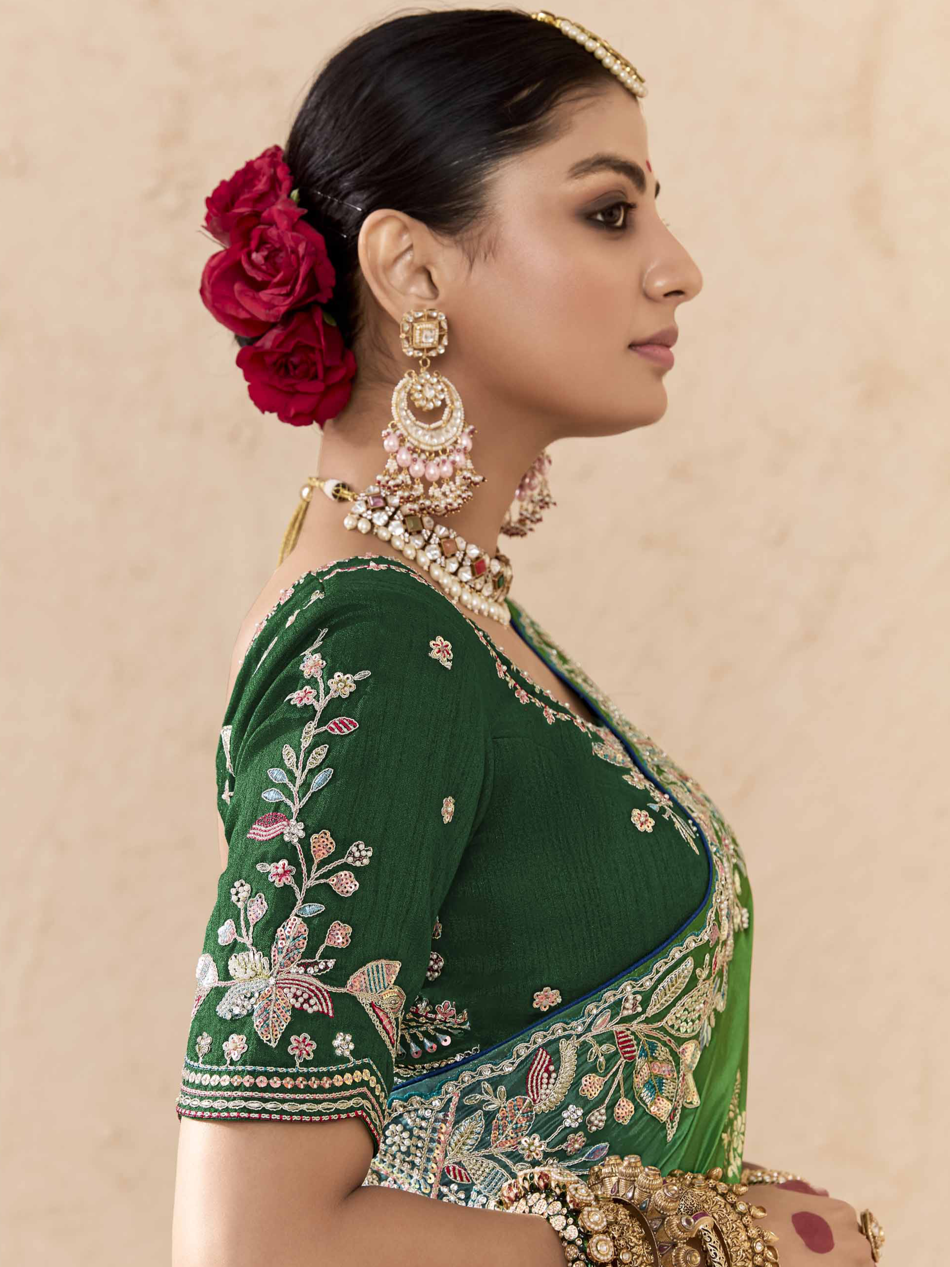 The blouse is in deep forest green color, which gives a strong contrast. It has a round neckline and short sleeves, with embroidery on the sleeves and back. The back also has a scooped cut with floral embroidery, matching the saree’s design.