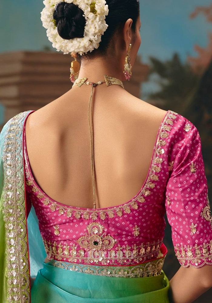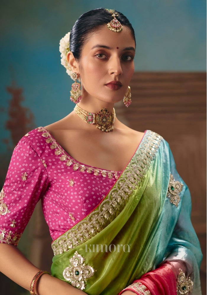 Crafted in luxurious tissue silk, this saree showcases a stunning multicolor gradient that flows effortlessly from fresh green and aqua tones into rich pink hues. The fabric carries a natural sheen, adding a soft, luminous elegance to every drape.