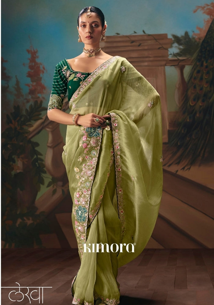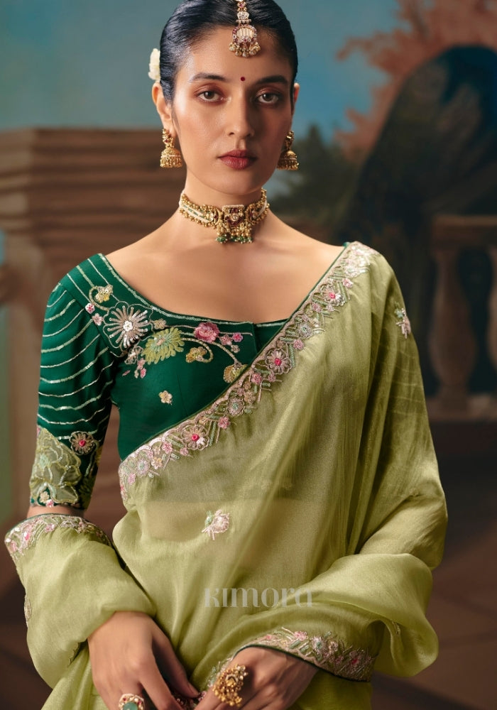 Experience graceful elegance with this exquisite Olive Green Tissue Silk saree, crafted to give a soft sheen and lightweight, flowy drape. The rich texture of tissue silk adds a subtle glow, making it perfect for weddings, festive occasions, and special celebrations. The saree is adorned with intricate 3D sequin work, fine resham embroidery, and beautifully detailed patch flower embroidery, creating a dimensional and luxurious look. Delicate sequin highlights add a refined shimmer across the body, while the elegant scallop embroidered border enhances the saree with a designer finish. It is paired with a Dark Green blouse, designed with heavy embroidery on the sleeves and back, perfectly complementing the saree’s floral detailing and ornate border.