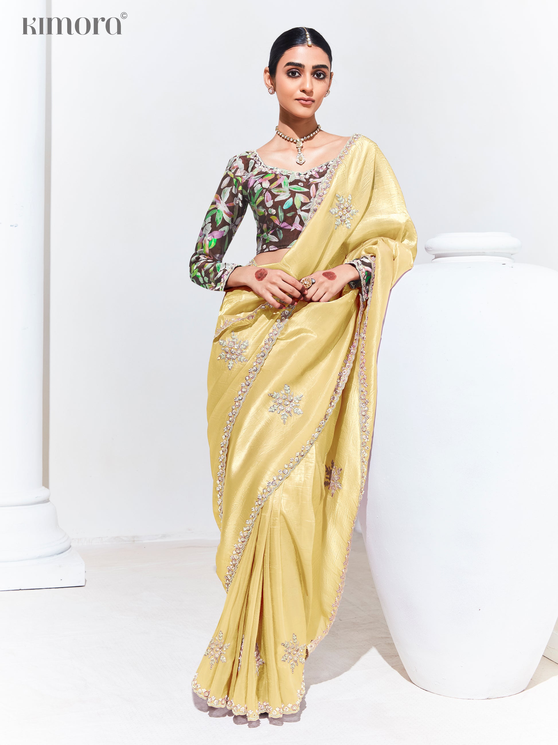 This Yellow Tissue Silk Saree is bright, cheerful, and perfect for weddings, festivals, and family functions. Made from soft tissue silk, it drapes smoothly and is comfortable to wear all day. The saree is decorated with zari, sequins, and bead work, giving it a sparkling and festive appearance.