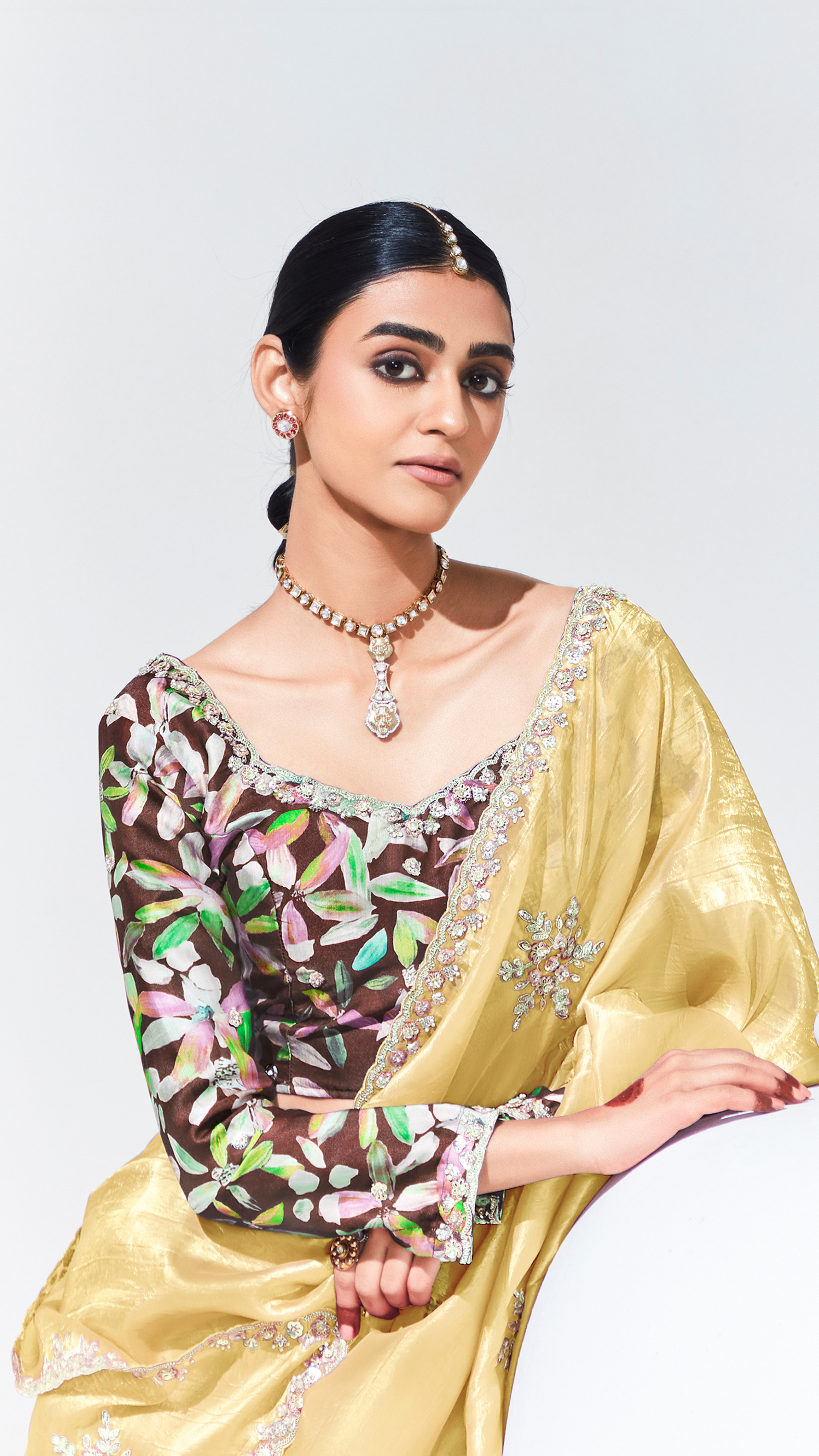 ✔ Work: Zari, Sequins & Beads on Saree; Multi Flower Print on Blouse