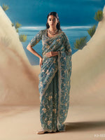 Teal Blue Organza Tissue Silk Hand Embroidered Bridal Saree
