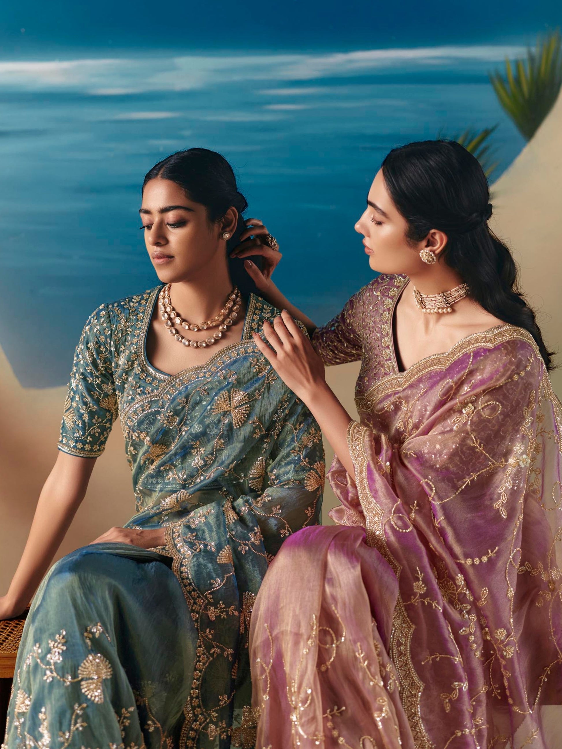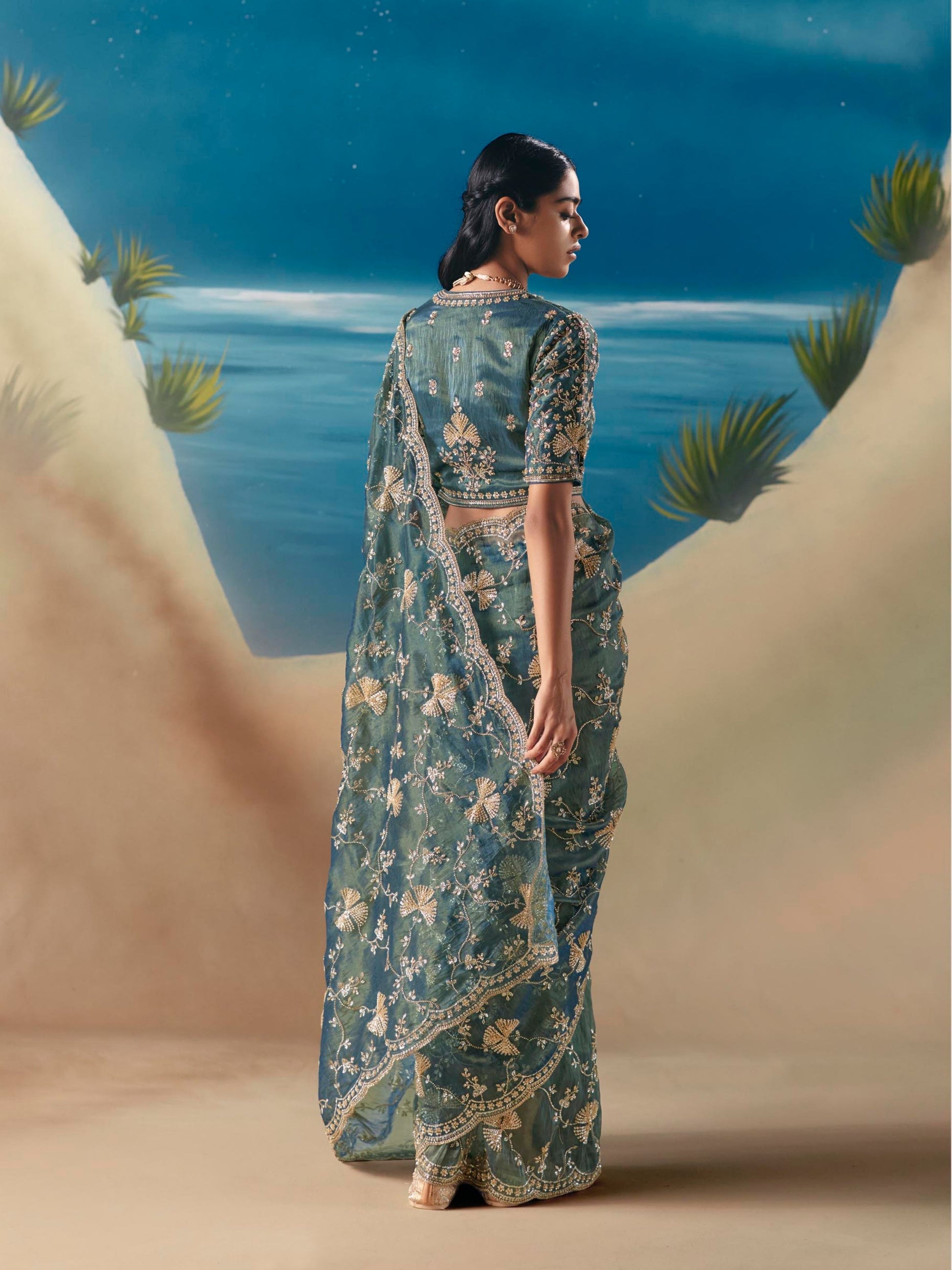 This exquisite blue-green Silk tissue Saree and Adorned blouse are truly opulent.