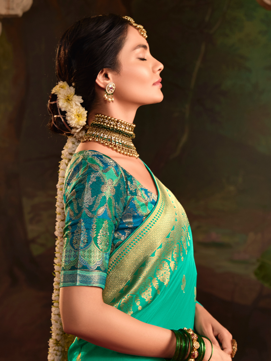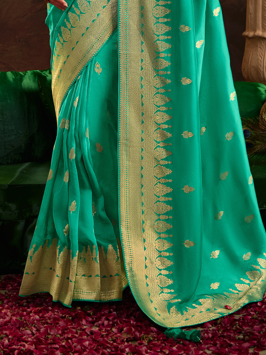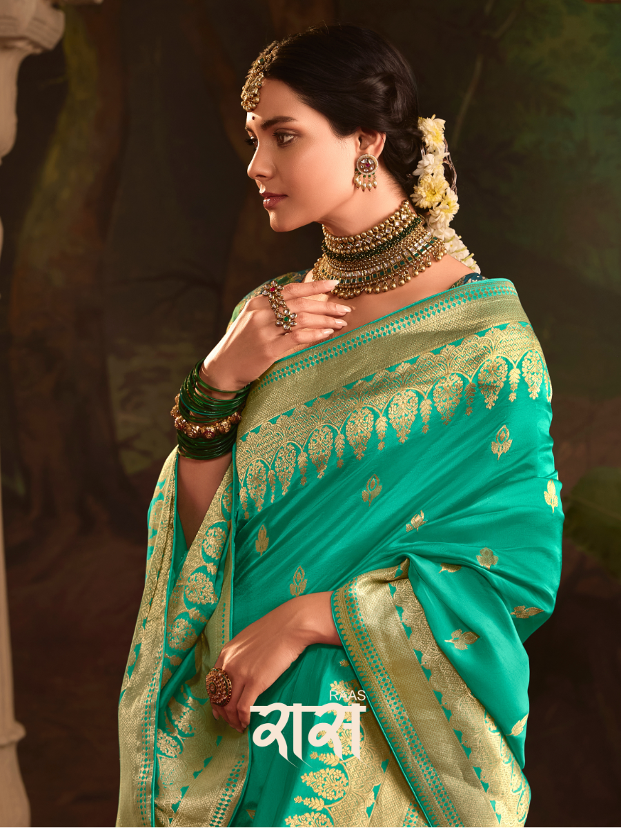 Teal Green Pure Silk Saree With Rich Golden Border & Designer Weaving Blouse