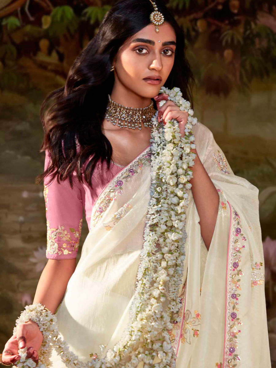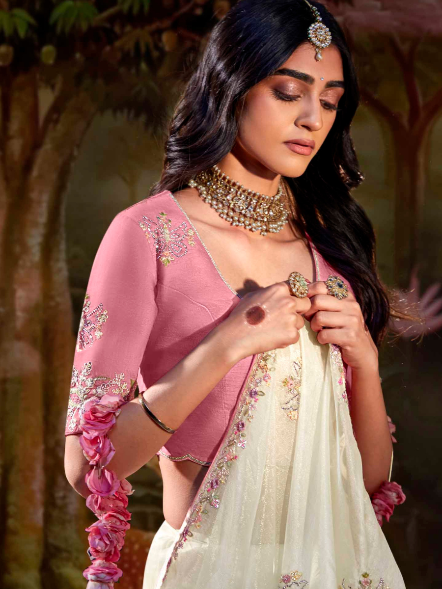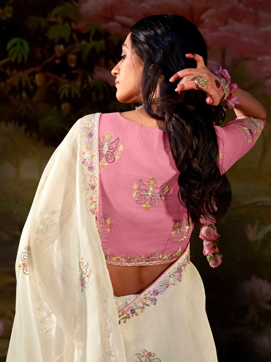 White Tissue Silk Saree with Pink Blouse
