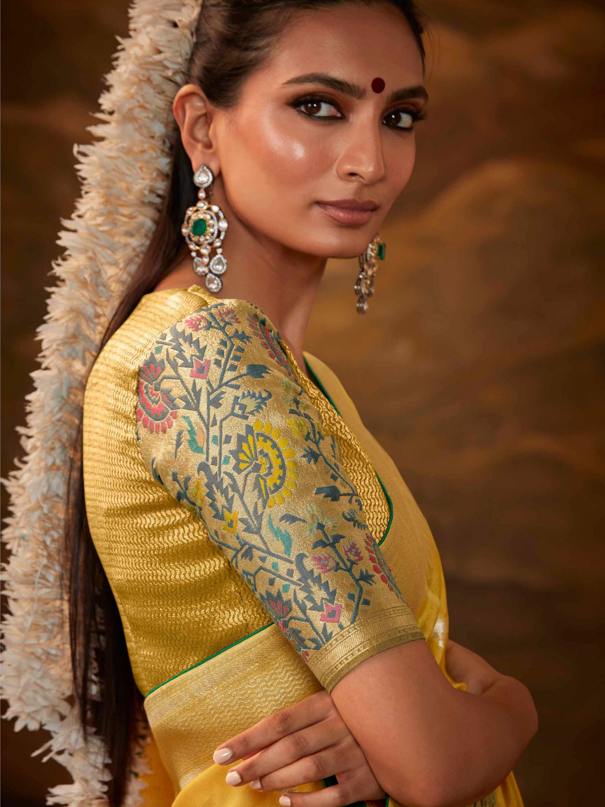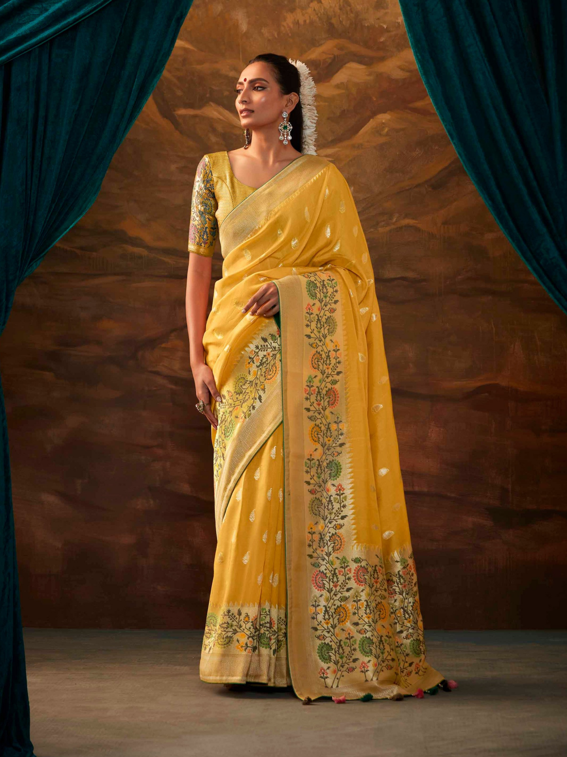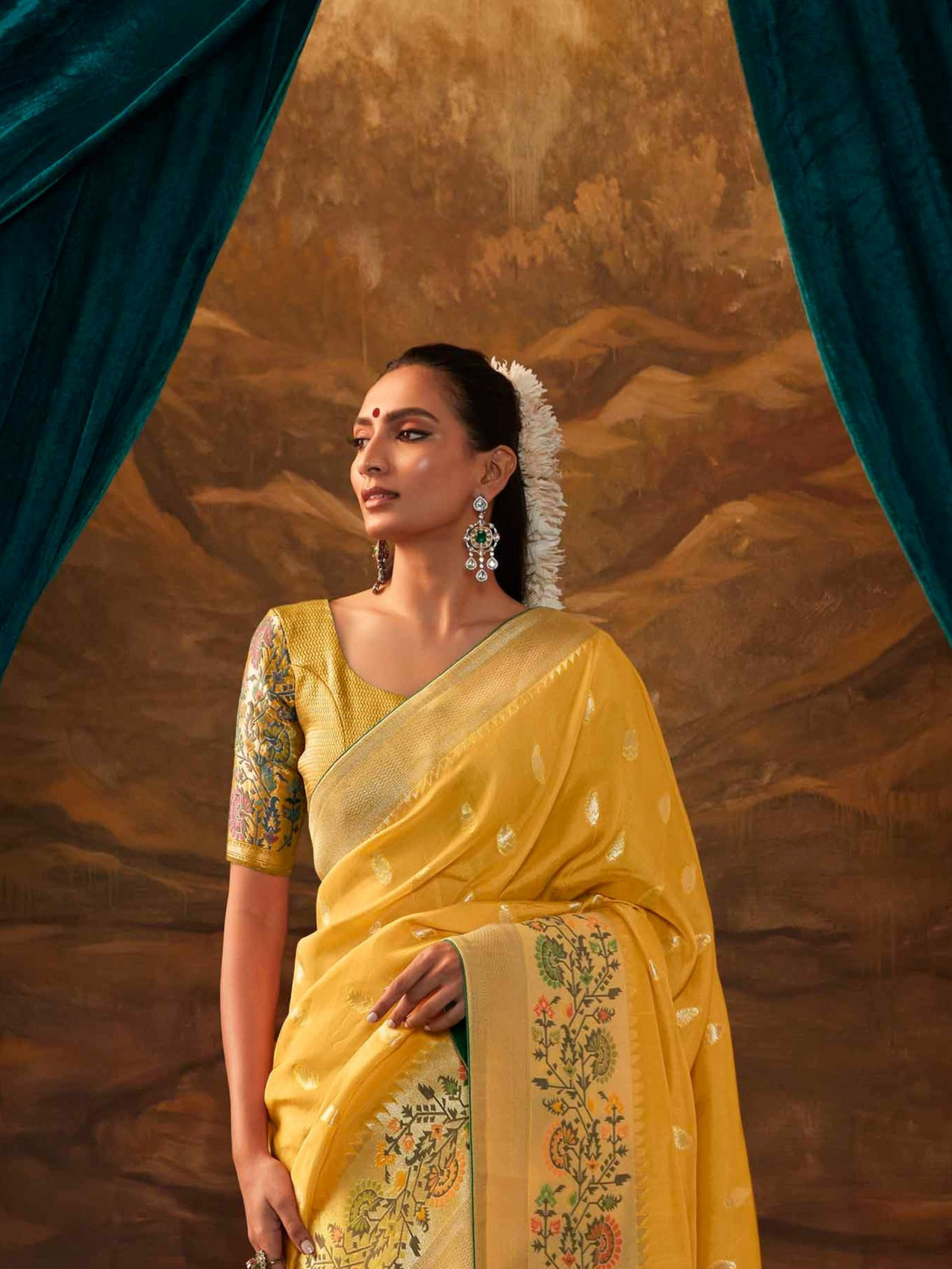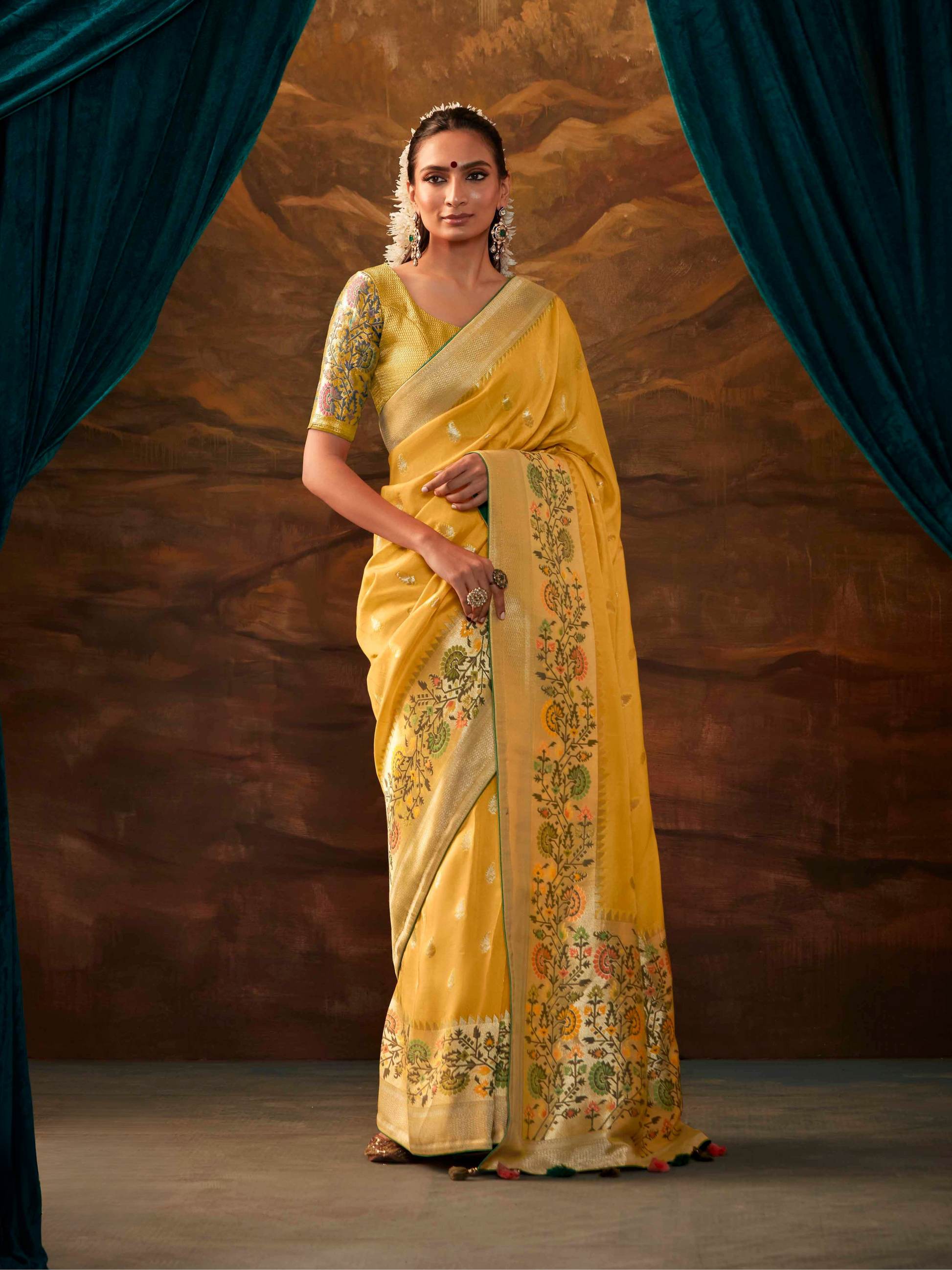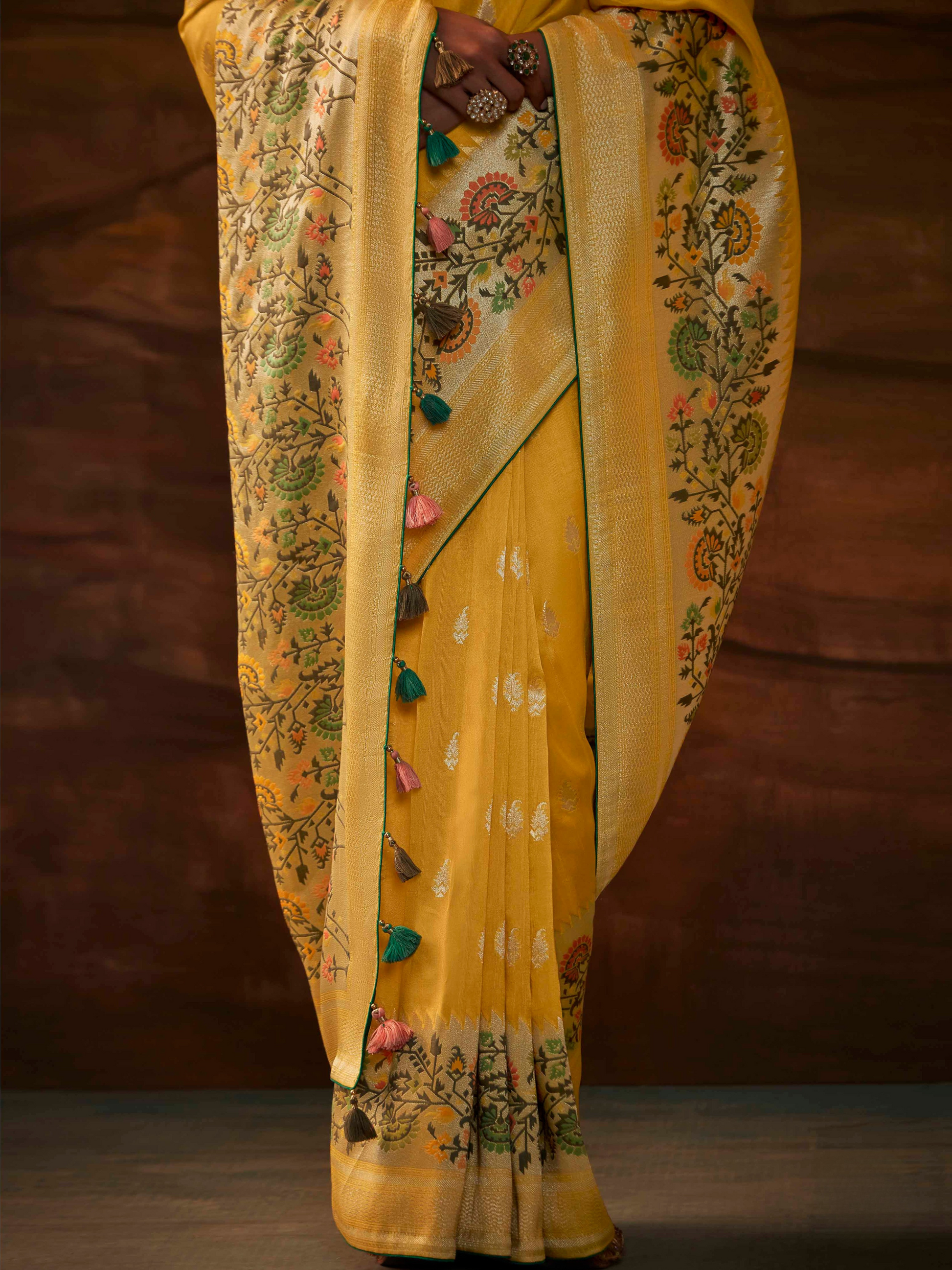 - Yellow Banarasi Silk Saree with Colorful Floral Weaving
