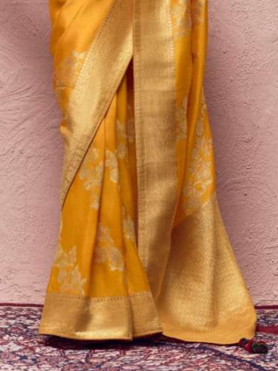This yellow crape fabric saree comes with a fine golden zari border and soft shine texture. The saree has light design work all over which gives a rich and royal look.