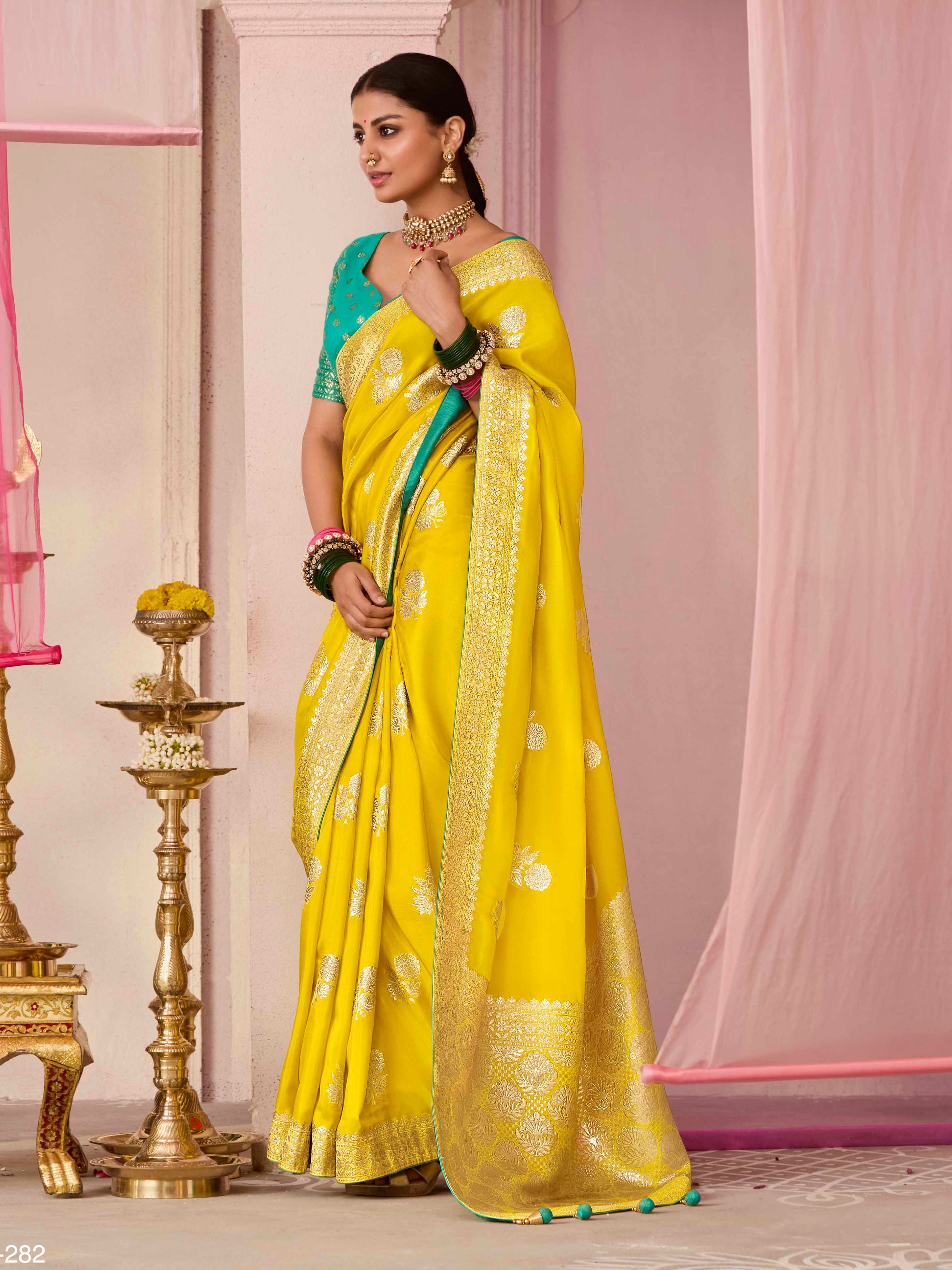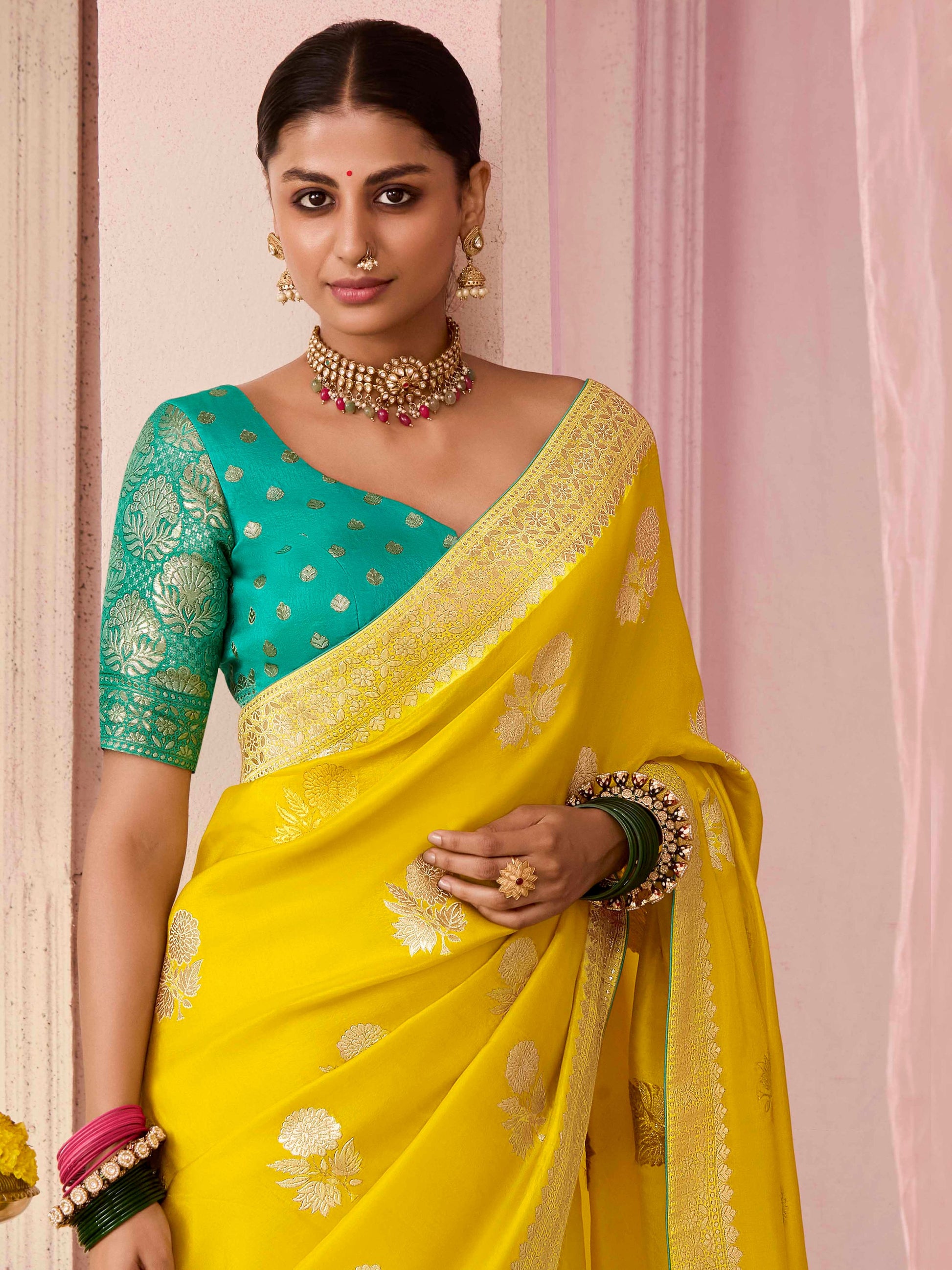 This marigold yellow Weaving Silk Saree and its jewel-toned teal blouse create a high impact classic look. It features beautiful Banarasi weaving work, a large border, and is finished with delicate pallu tassels