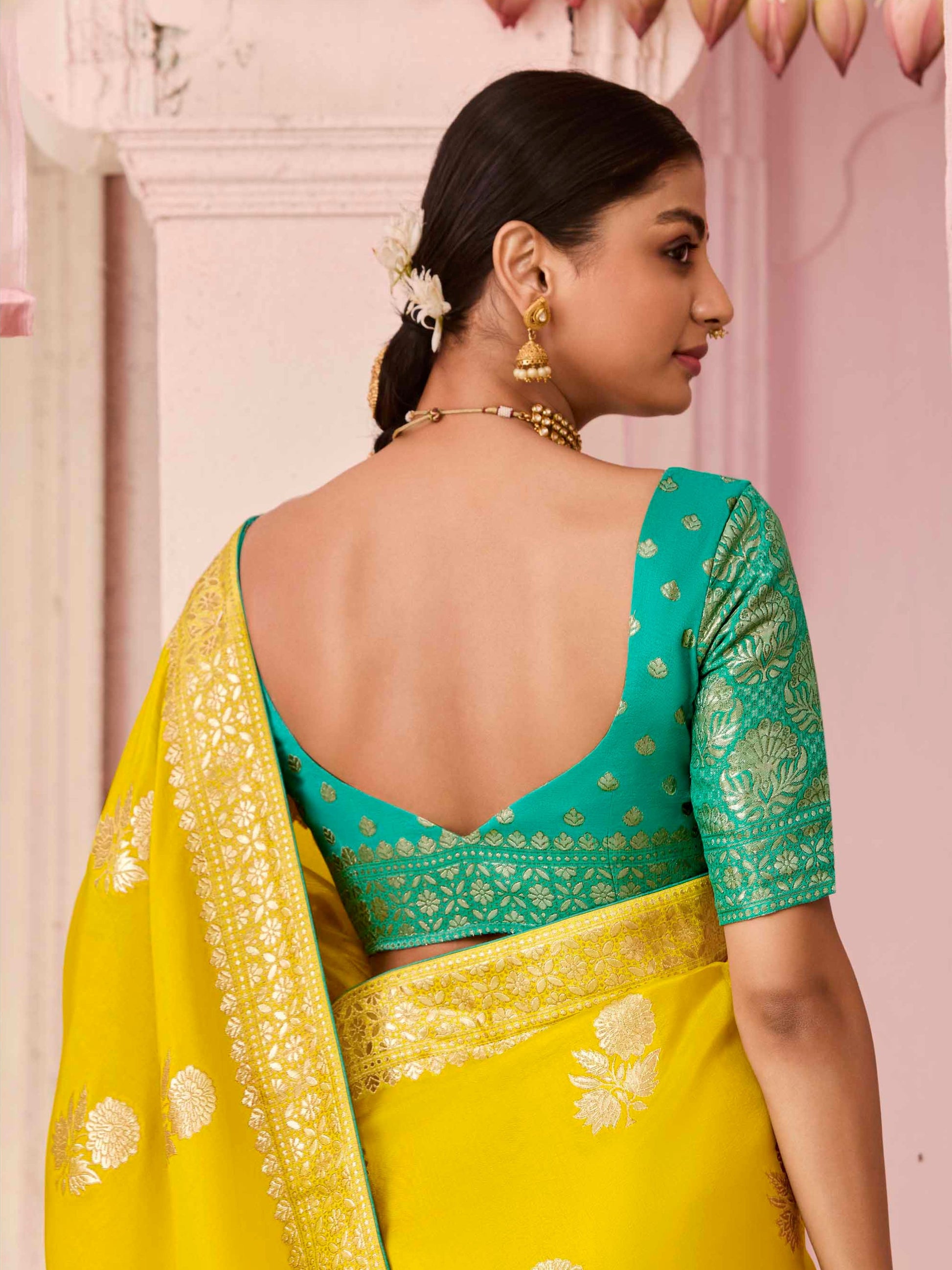 - Marigold Yellow Weaving Silk Saree with Teal Blouse