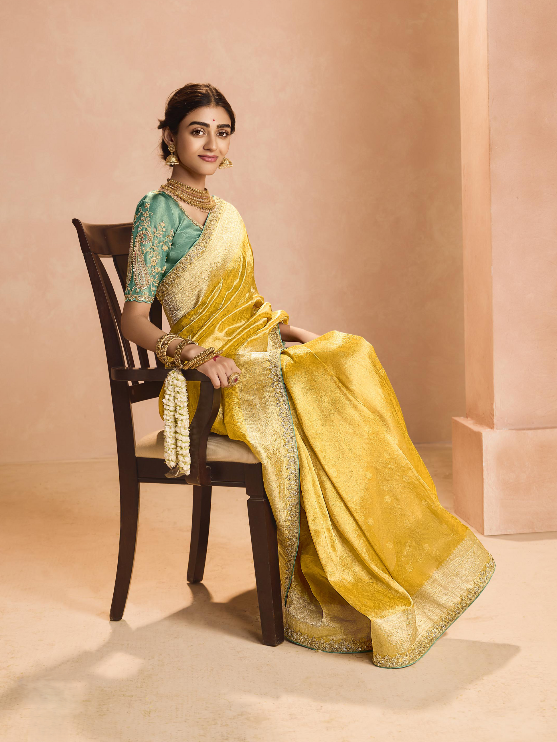 Yellow Kanjivaram Silk Saree with Sea Green Embroidered Blouse