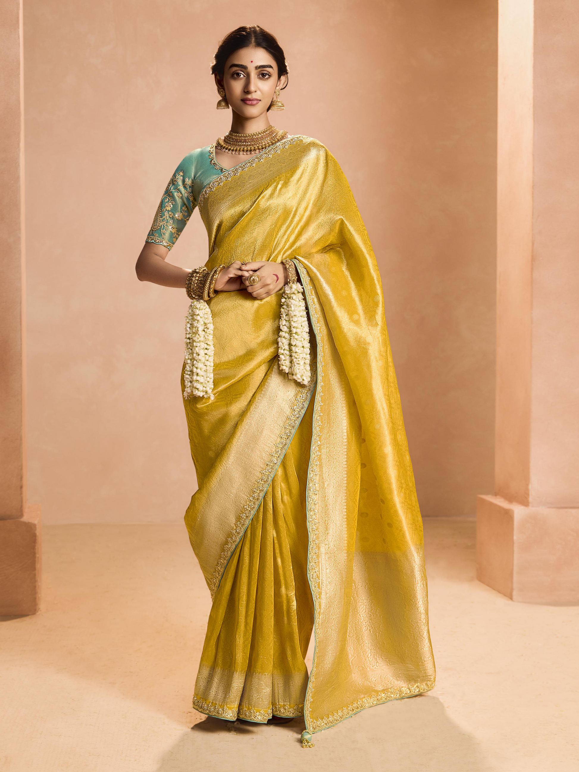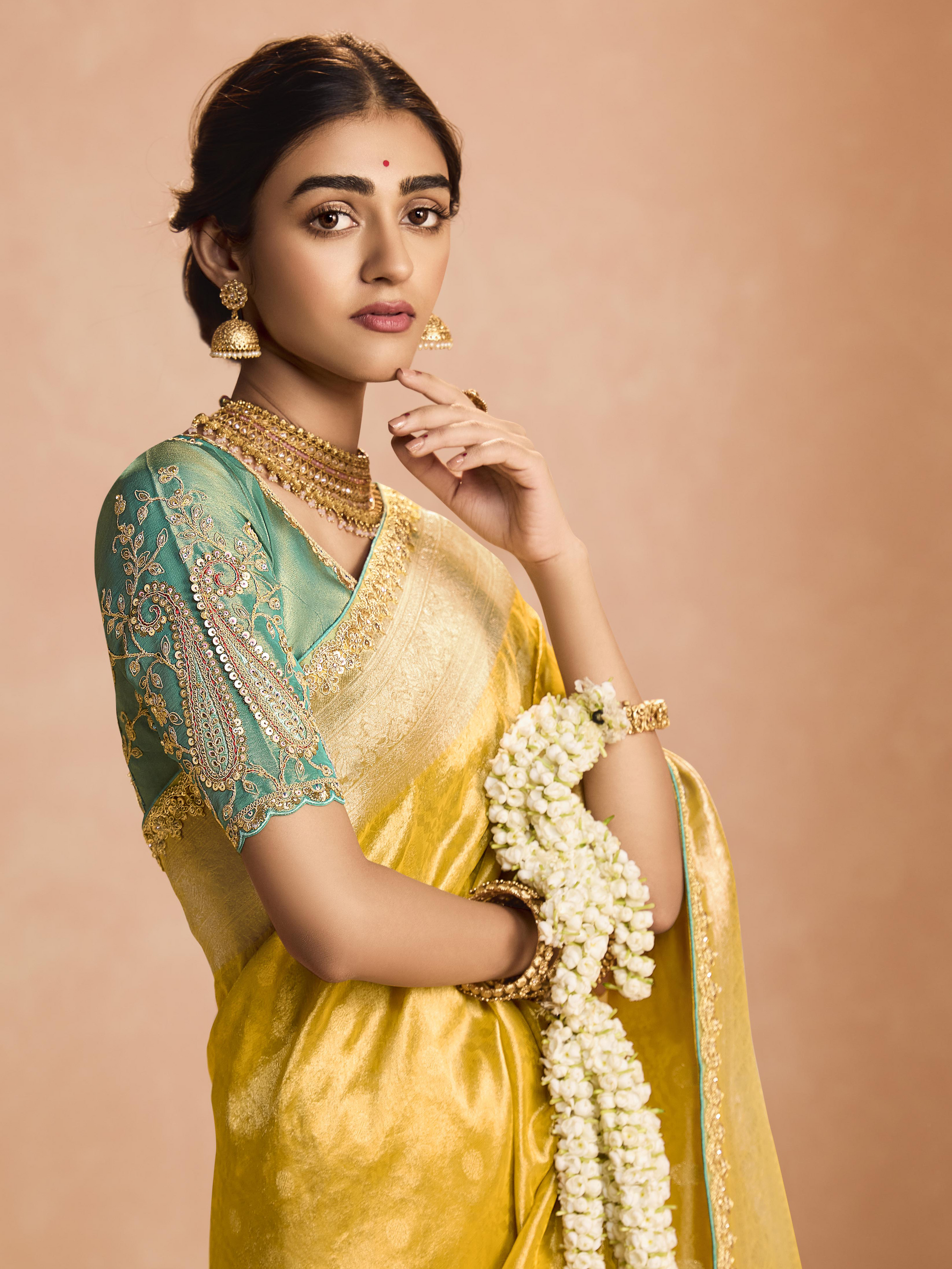 - Yellow Kanjivaram Silk Saree with Sea Green Embroidered Blouse