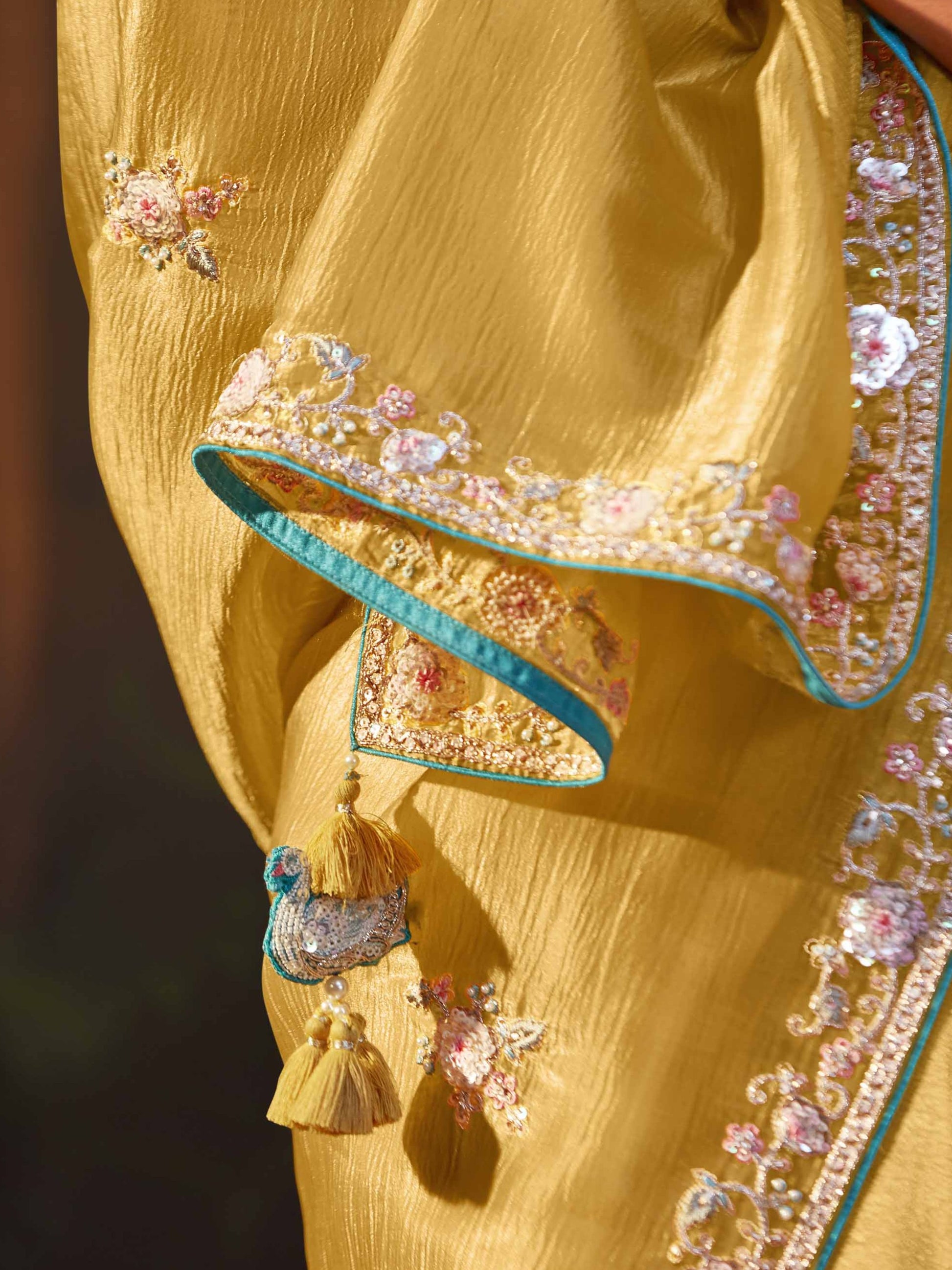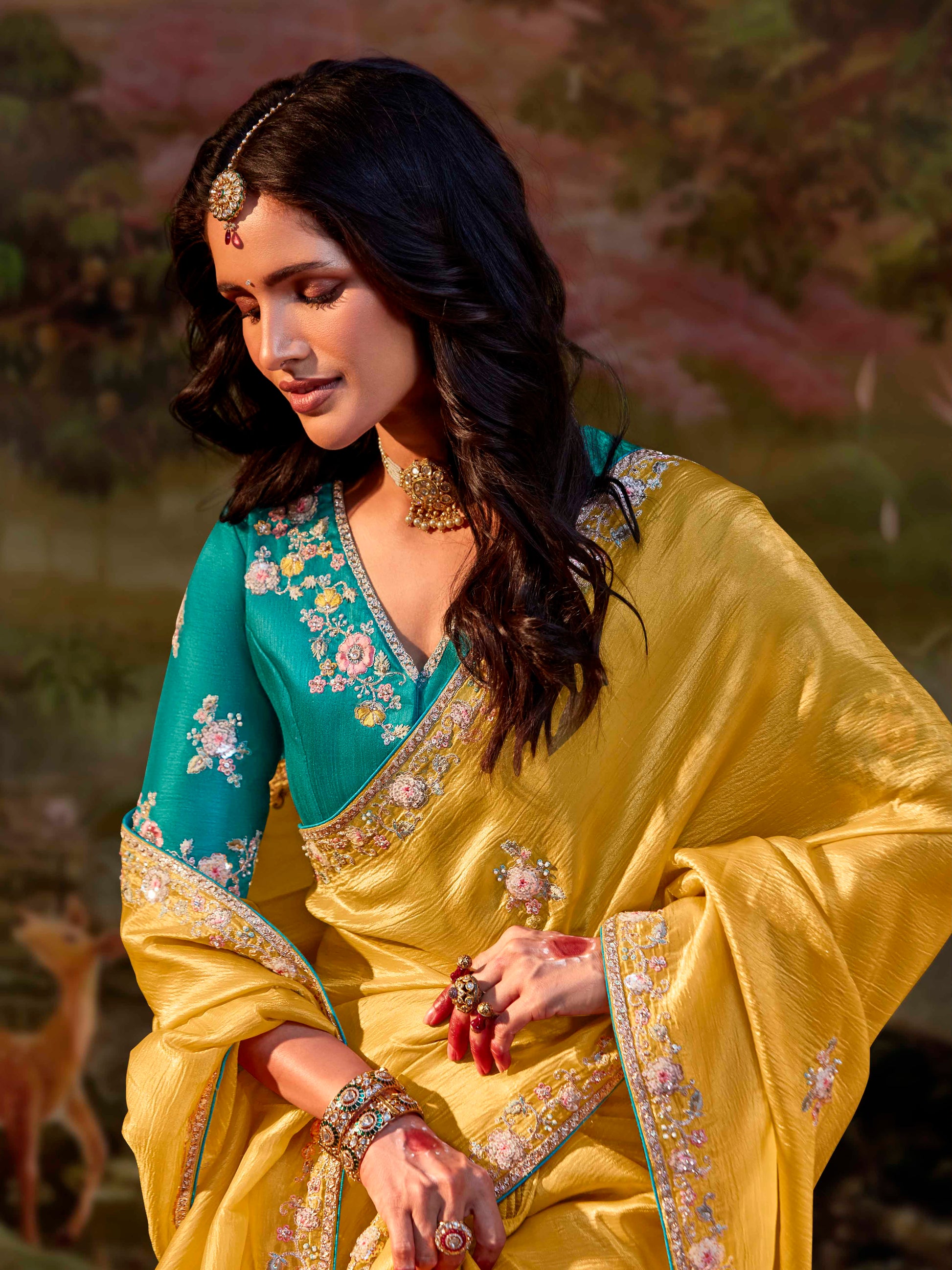 - Yellow silk saree featuring dori and pearl work