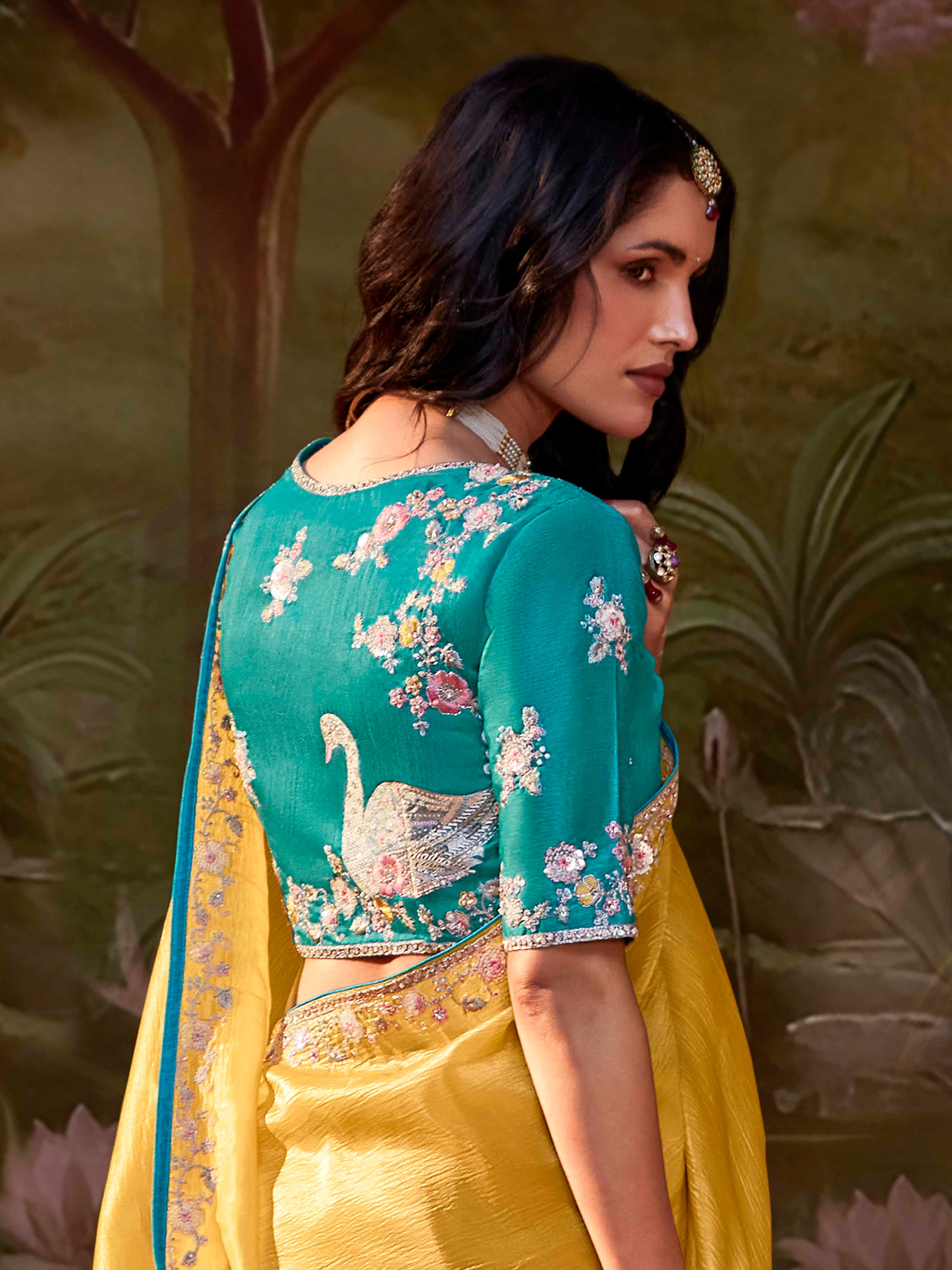 shine bright at any occasion with this yellow silk saree featuring dori and pearl work. Perfect for weddings, festive events, and parties, this saree combines tradition with a modern touch. The cheerful yellow color adds freshness, while the delicate dori and pearl detailing give it a classy and charming look.