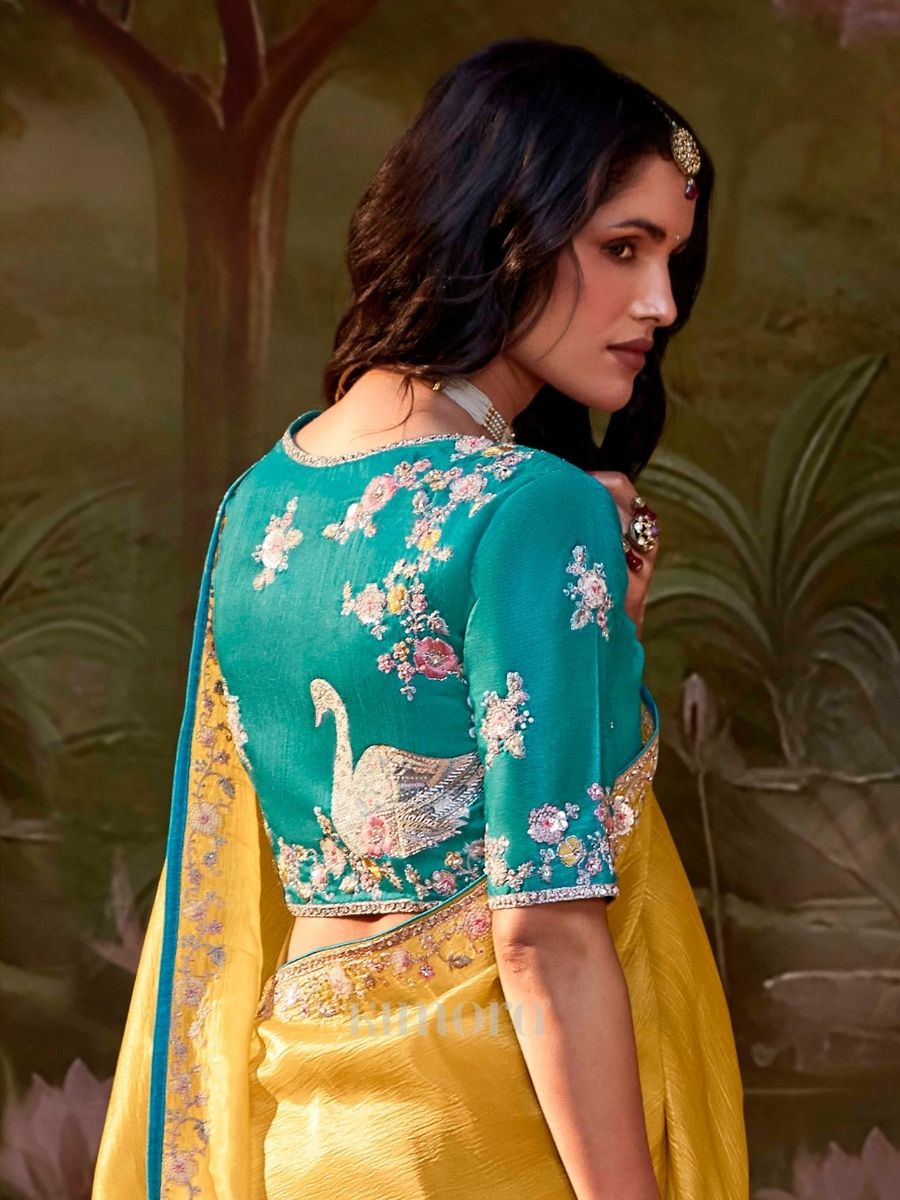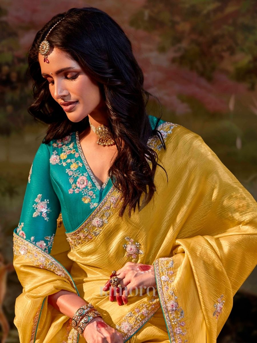 This yellow heavy organza saree radiates a regal and festive charm with its rich color and structured yet flowy drape. The organza fabric gives a graceful volume and soft sheen, making the saree look grand while still feeling light to carry. Delicate sequence and resham embroidery is intricately done along the border and scattered motifs, adding fine detailing and subtle sparkle that enhances the elegance of the saree without overpowering its natural beauty.