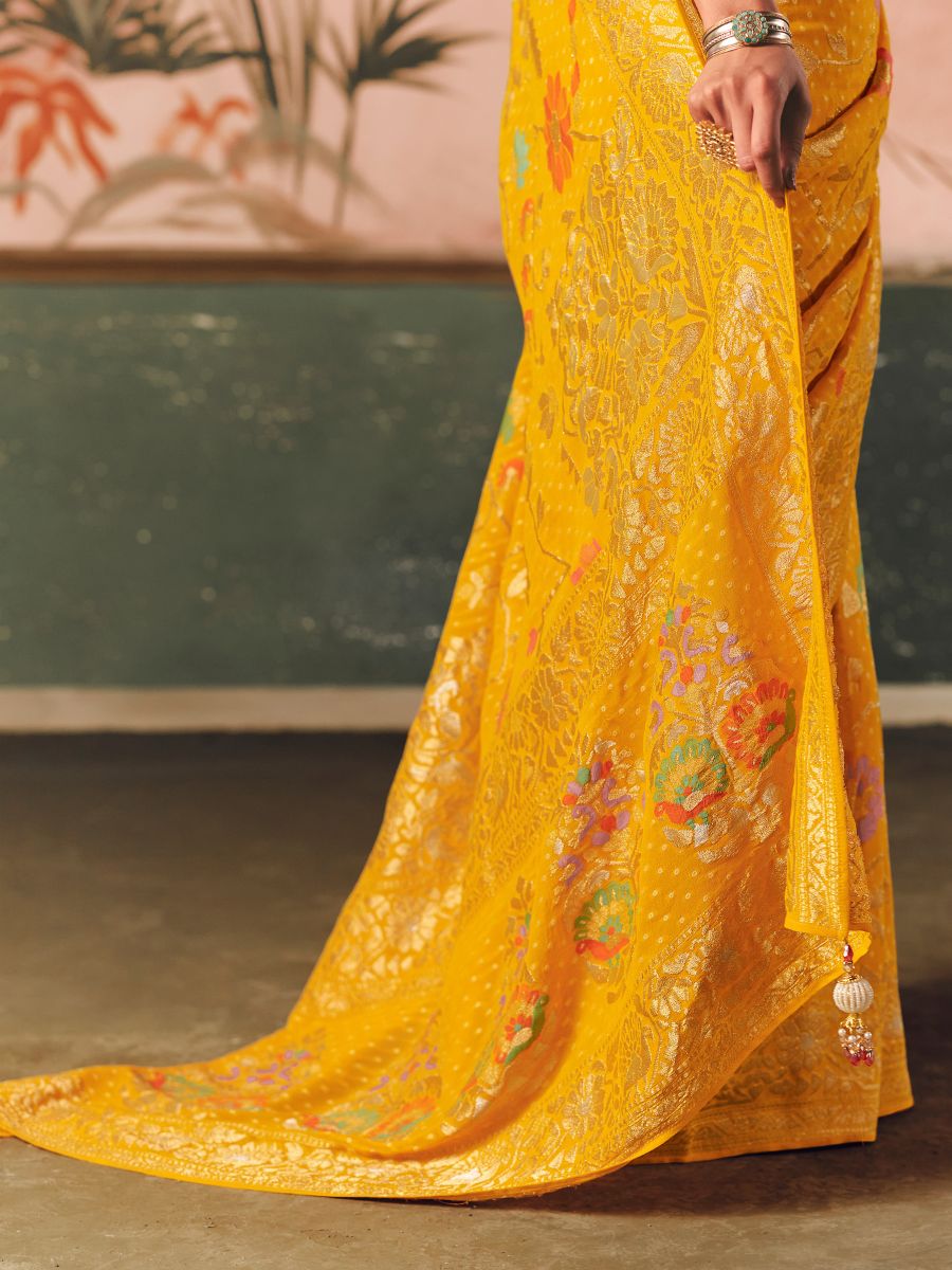 - Yellow Pure Georgette Bandhani Saree With Zari Work and Contrast Blouse