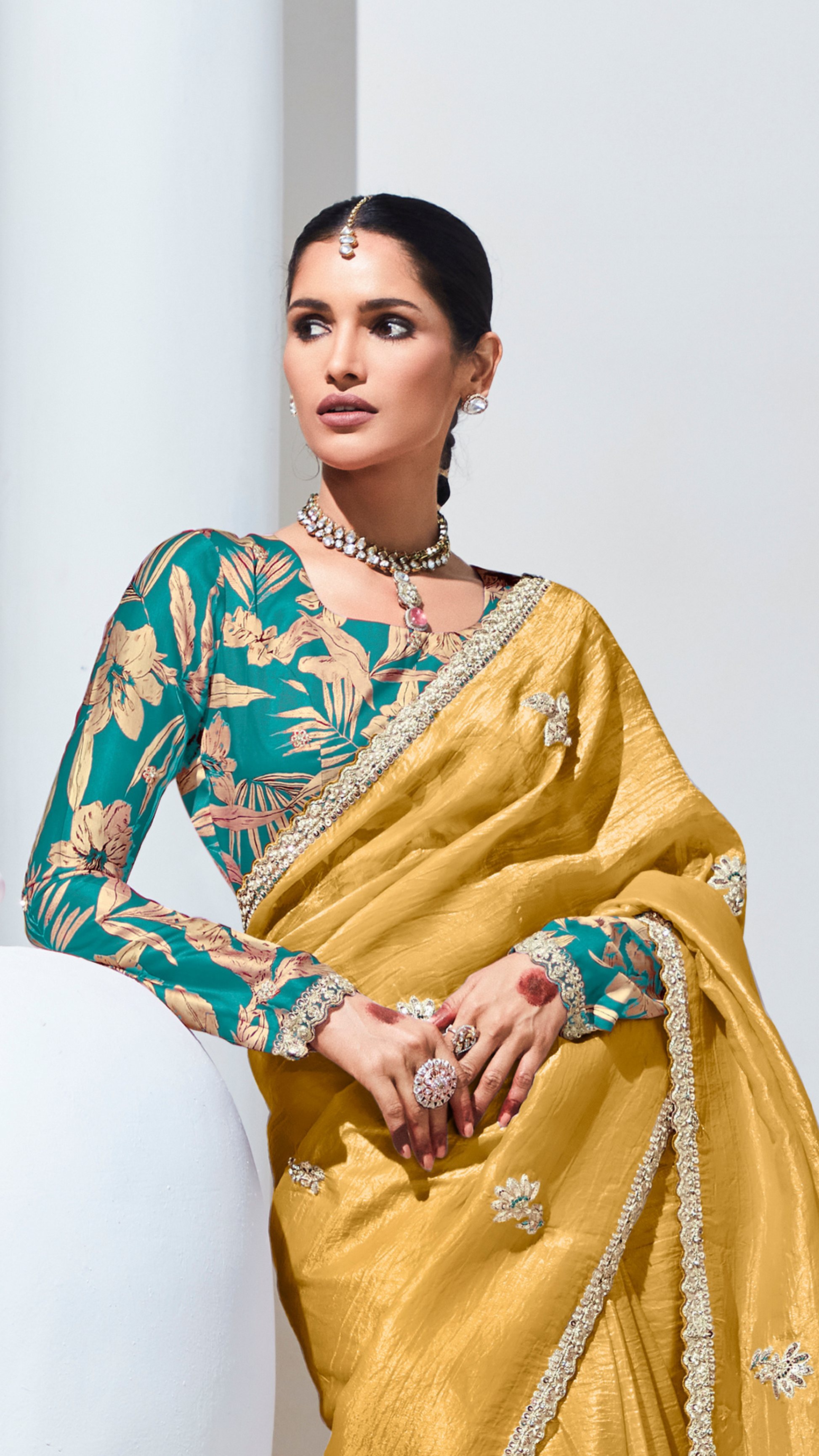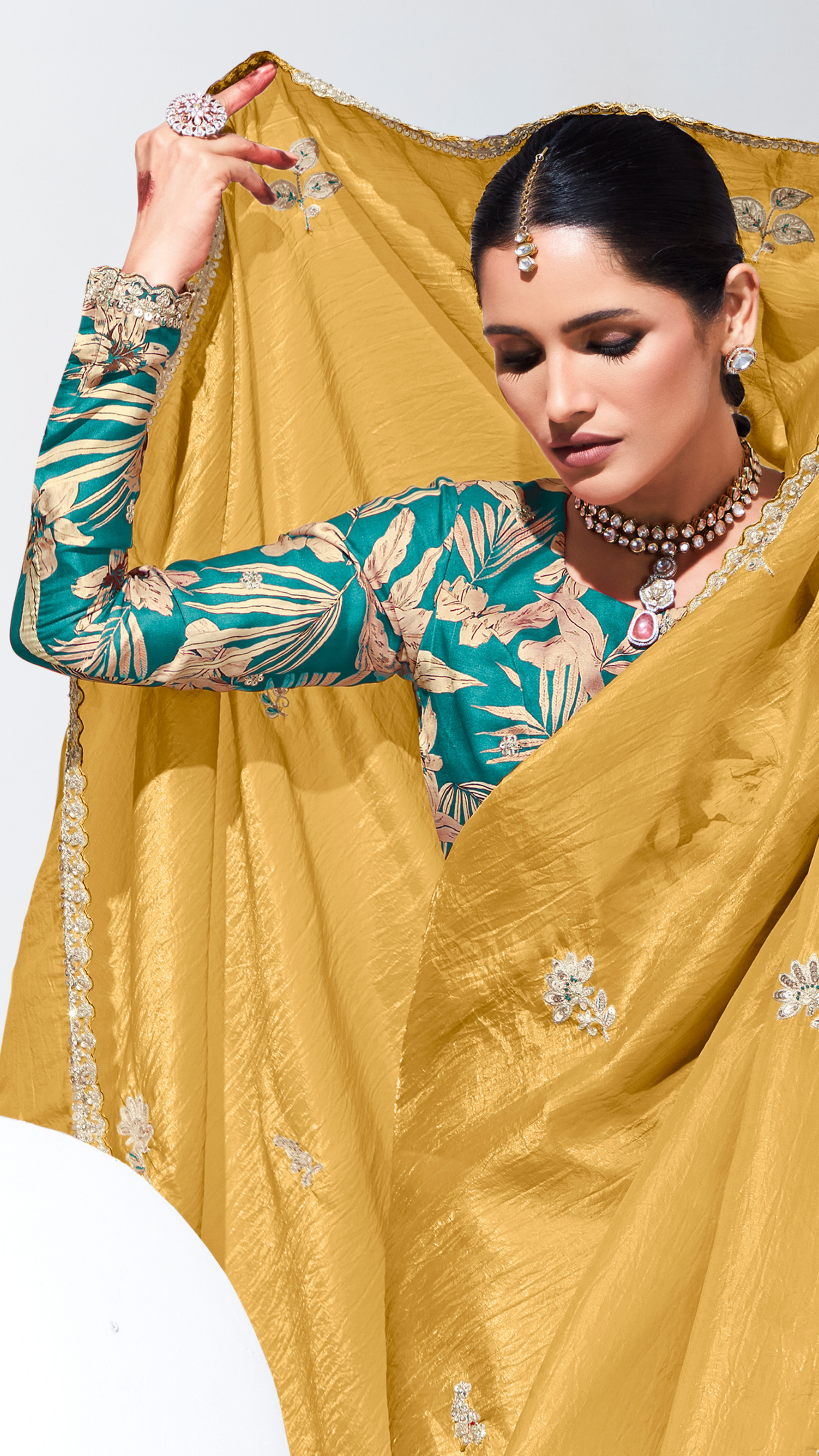 Look stunning in this yellow tissue silk saree with zari, sequins, and beads work that adds sparkle and style. Perfect for weddings, festivals, and parties, this saree gives a bright and cheerful look while keeping it traditional.