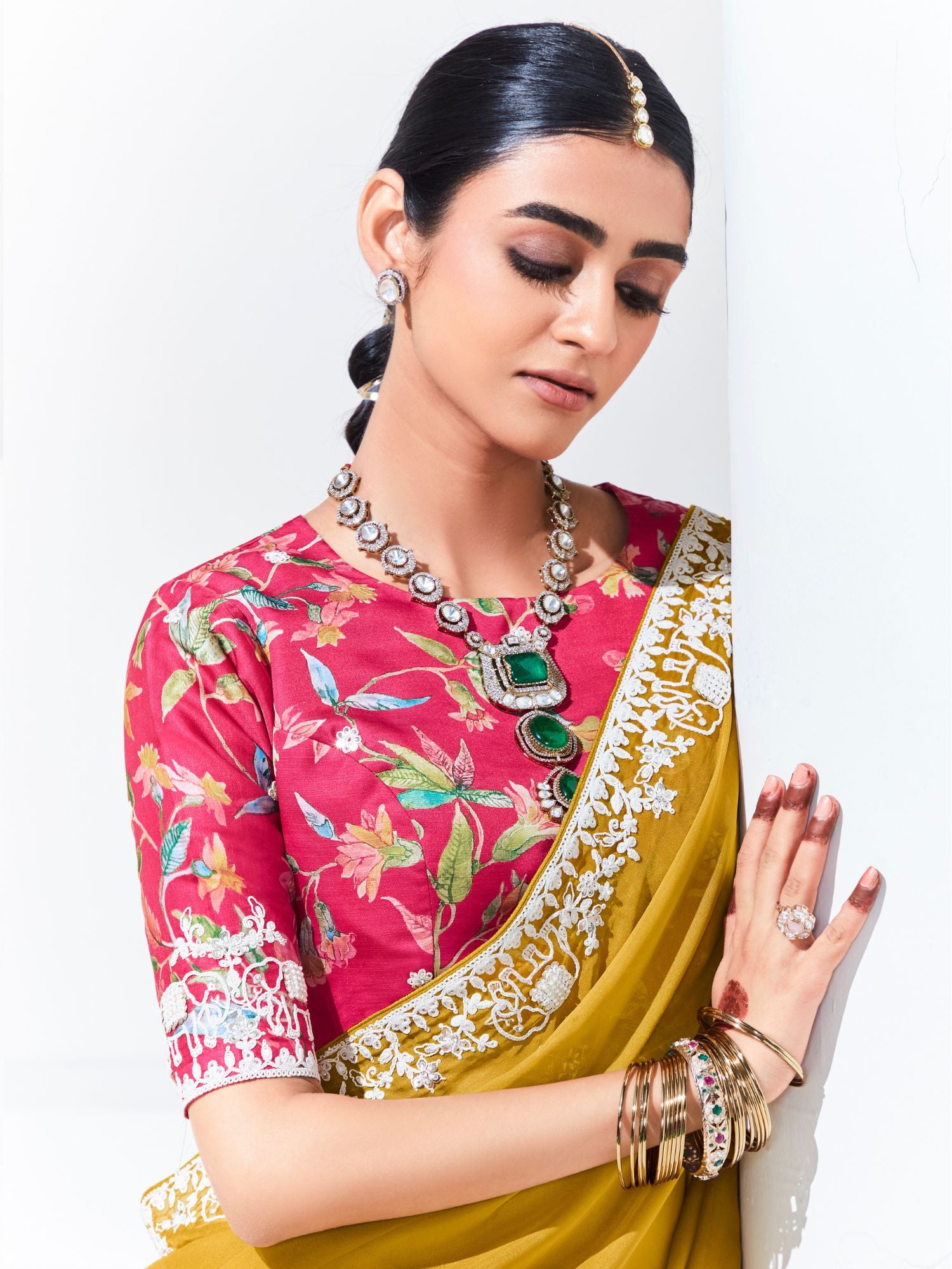 You can wear this saree for any special occasion. Pair it with simple jewelry for a day event or bold accessories for the evening. Its bright colors and pretty embroidery make it perfect for wedding functions, festivals, and party wear.