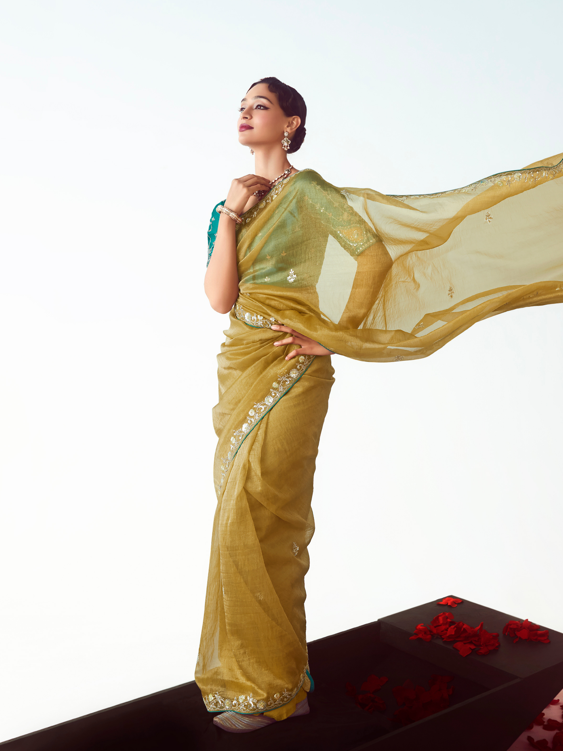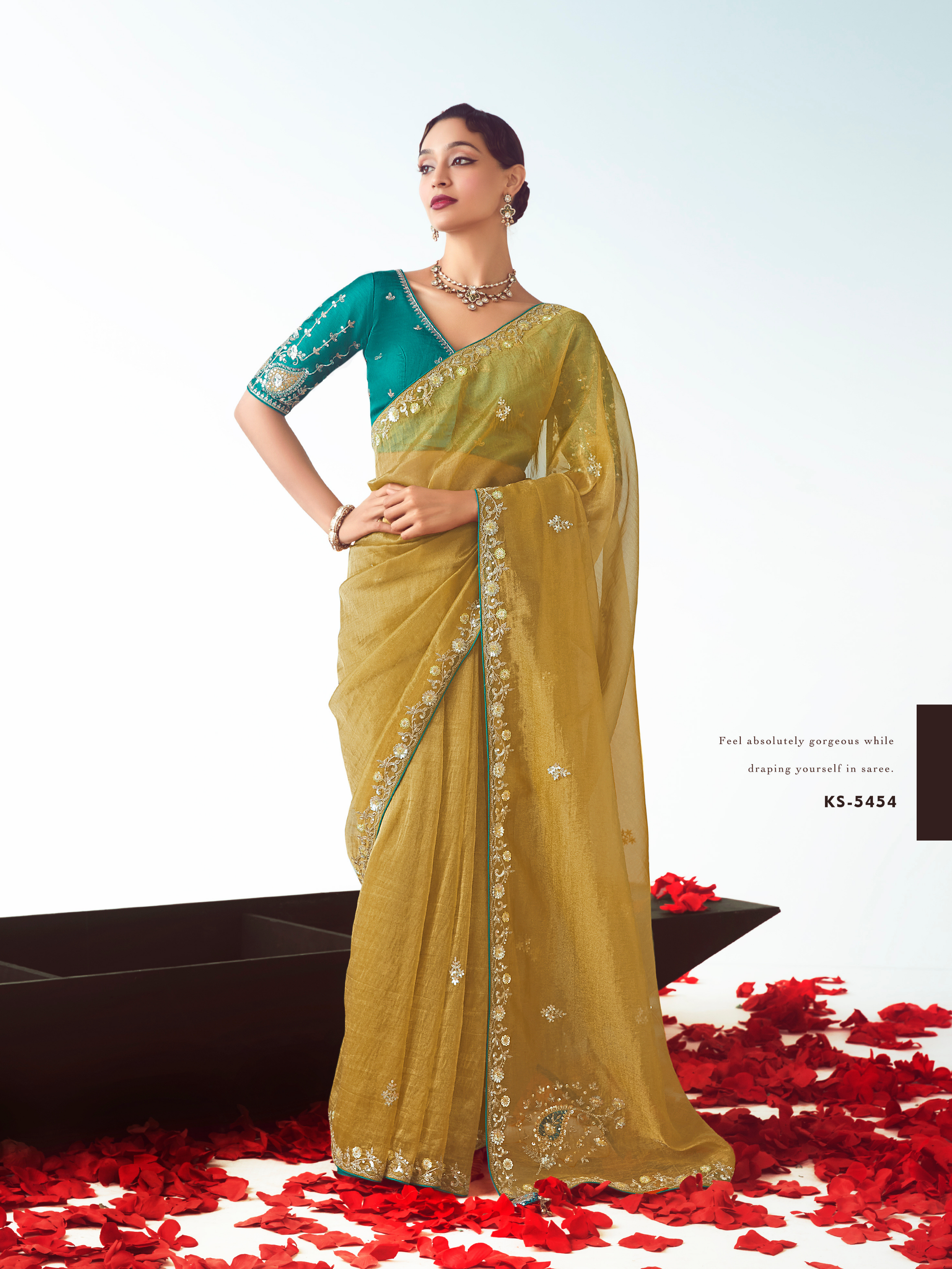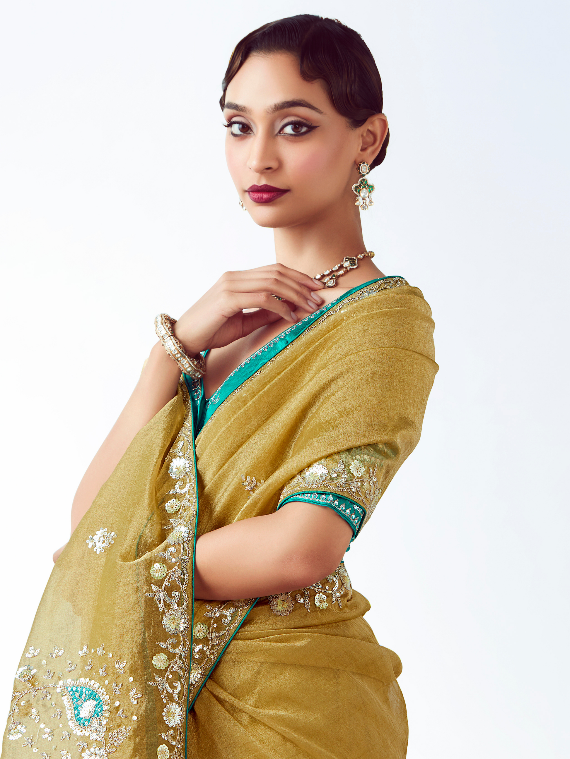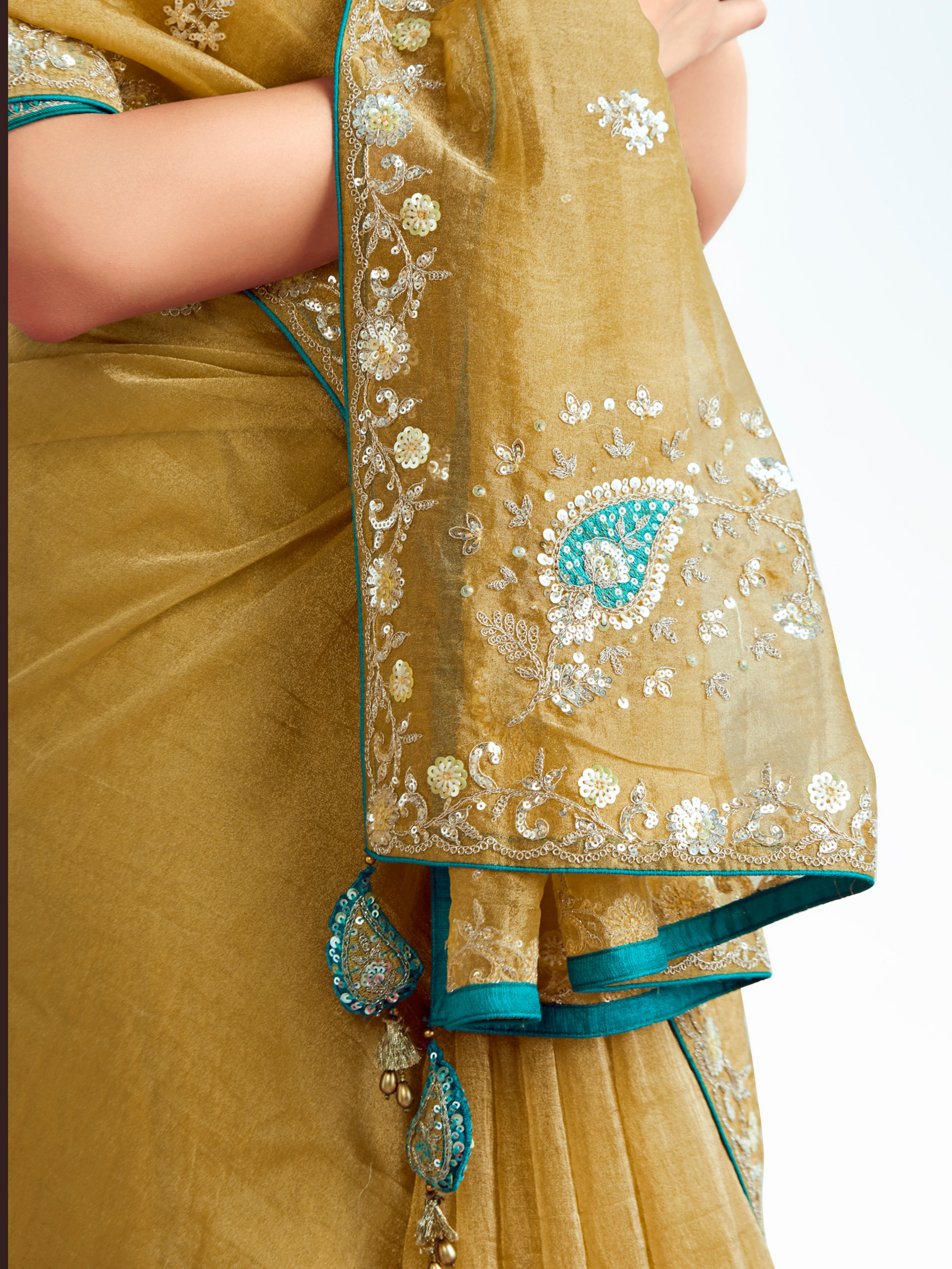 Look graceful in this yellow organza saree with zari and sequins work, a perfect choice for weddings, festivals, and parties. The bright yellow color adds a cheerful touch, while the sparkling zari and sequins make it stand out at any occasion.
