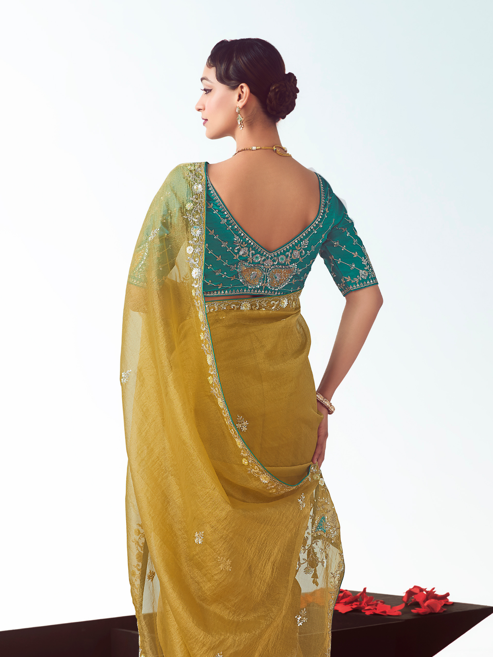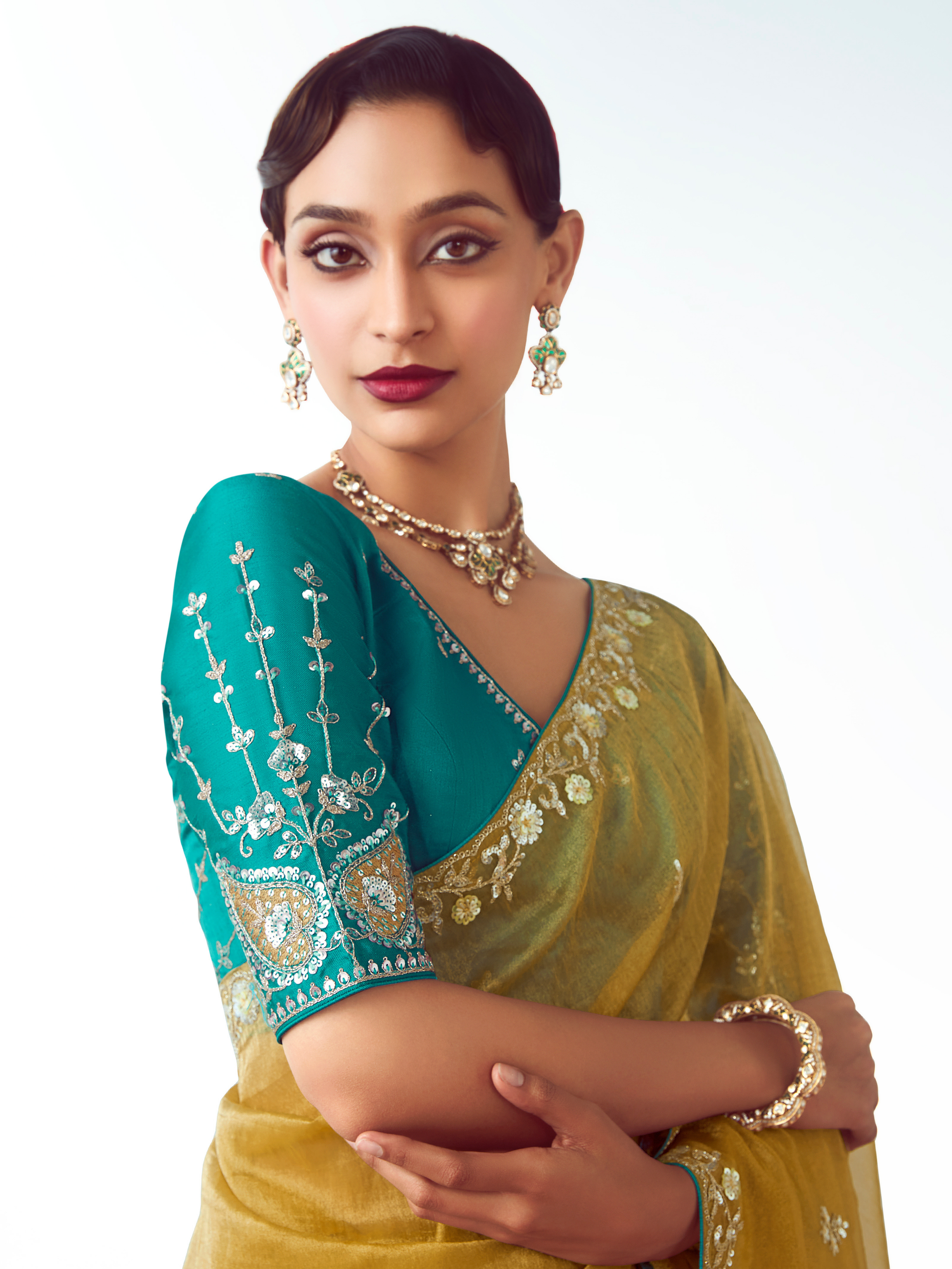 The saree is made from soft organza fabric, which is lightweight, smooth, and easy to drape. It feels comfortable even when worn for long hours. The matching teal silk blouse with zari and sequins work creates a stunning contrast, giving you a stylish and trendy look.